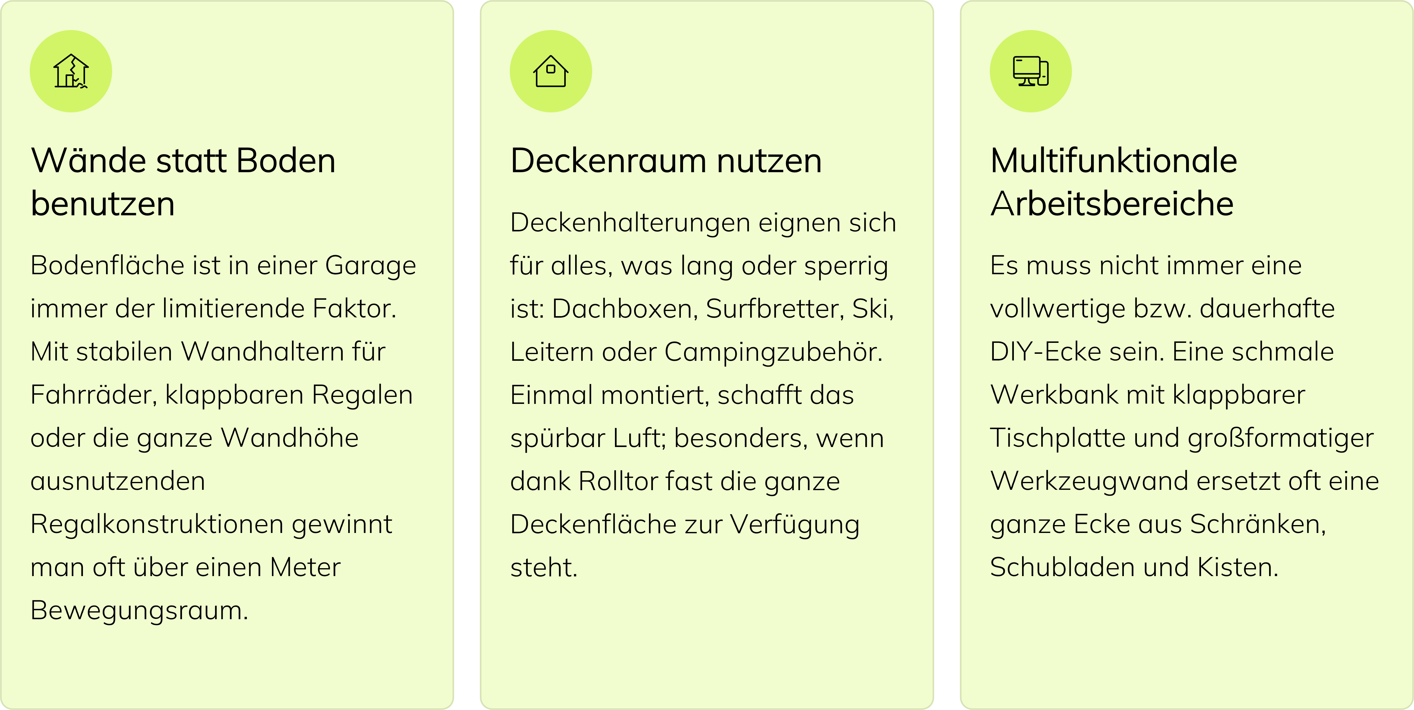 Eine Garage im Gesamten baulich zu vergrößern, ist vielerorts nicht möglich und sowieso die teuerste Variante. Das heißt aber nicht, dass man nicht doch mehr Nutzfläche zubauen könnte. Einige Denkansätze dazu: