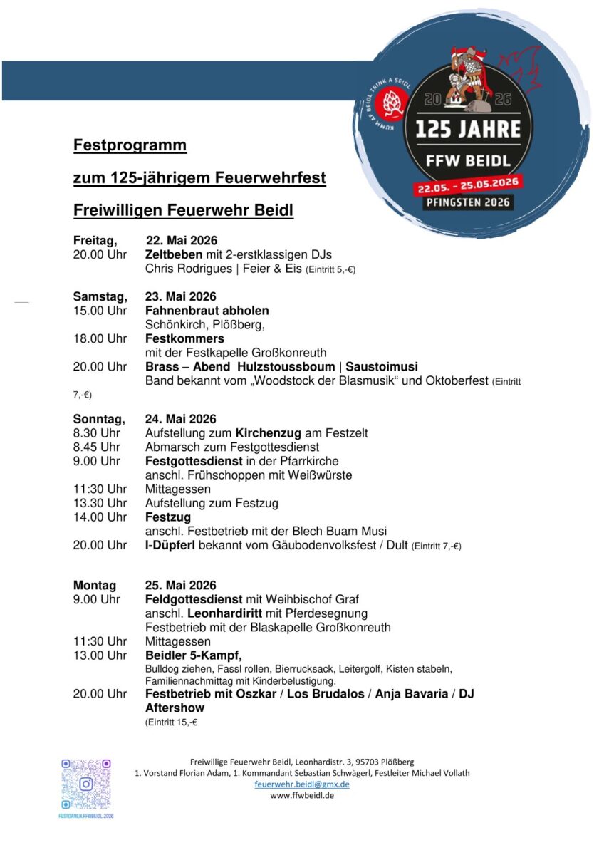 Eben genau dieser tritt langsam aber sicher im Dorf Beidl bei Plößberg mehr und mehr auf. Die Freiwillige Feuerwehr wird zu Pfingsten 2026 ihr 125-jähriges Jubiläum begehen. Aber wie! Die Feierlichkeiten dauern vom Freitag, den 22. Mai, bis Pfingstmontag, den 25. Mai. In dieser Zeit ist in Beidl sehr viel geboten.