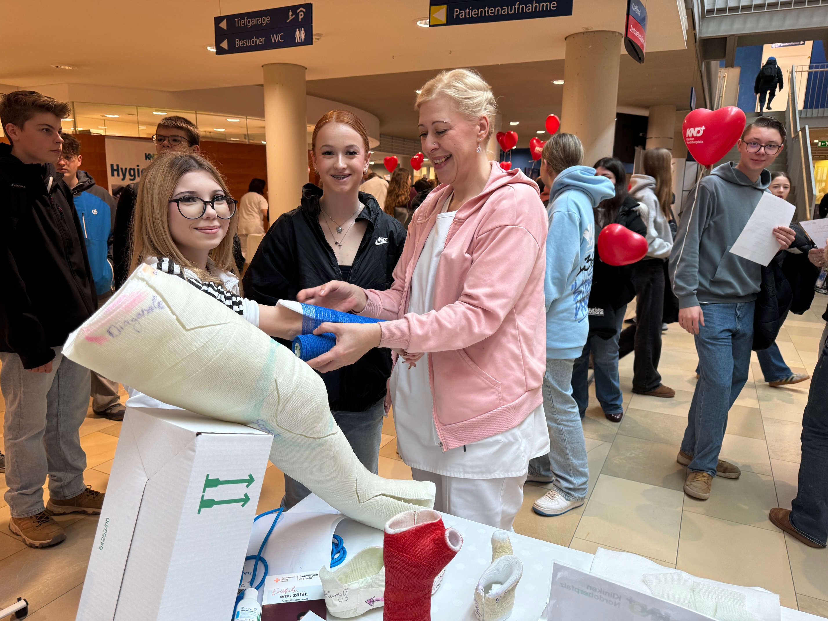Dazu hatten sich im Vorfeld KNO-Pflegedirektorin Angela Dzyck und ihr Team, allen voran Heidi Häupler, viel Mühe gemacht. Das Ergebnis wurde von den Jugendlichen von Mittel-, Wirtschafts- und Realschulen der Region mit großem Interesse aufgenommen. Einige erkundigten sich gleich nach Praktika oder ließen sich die Ausbildungszweige an der Akademie für Gesundheit NEW Life erläutern. Das Bayerische Rote Kreuz zeigte Möglichkeiten auf, ein Freiwilliges Soziales Jahr in der Pflege zu absolvieren. Auch die Agentur für Arbeit gab den Fachkräften von morgen Tipps zur Berufswahl. Bei den Gesprächen an den einzelnen Ständen staunten einige, dass Pflegeberufe inzwischen zu den bestbezahlten Tätigkeiten ohne Studium gehören.