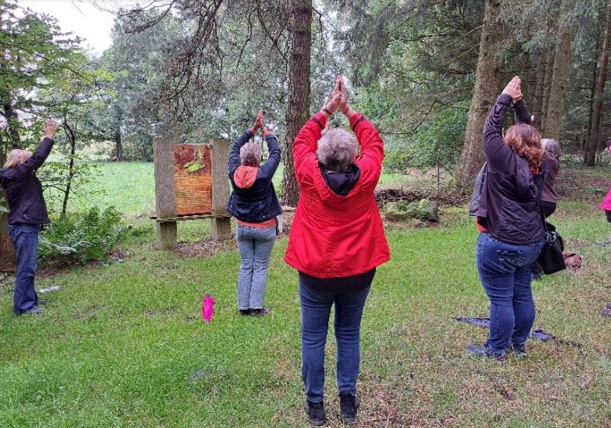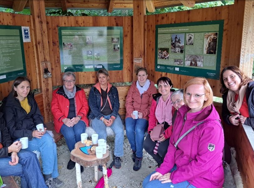 Am Freitagnachmittag ging es in Konnersreuth mit der Yoga-Lehrerin und IKom-Mitarbeiterin Belinda Hoyer mit verschiedenen Achtsamkeitsübungen auf den Waldbesinnungspfad. Einmal nur auf den Moment und die eigenen Sinne konzentrieren, leise durch den Wald wandern und nur auf den Blick oder den Geruch achten, das waren die ersten Aufgaben, die durch die eineinhalbstündige Wanderung führte. Zwischendrin wurden an den Glasstelen des Pfades verschiedene Übungen durchgeführt. So erlebten die Teilnehmer einen ganz besonderen Nachmittag mit anschließendem kleinem Teebuffet und Keksen im gemütlichen Pavillon.