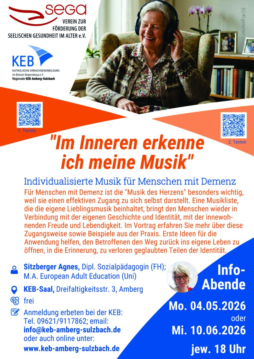 Unter dem Titel „Im Inneren erkenne ich meine Musik“ laden die Kath. Erwachsenenbildung (KEB) Amberg-Sulzbach und SEGA e.V. am Montag, den 4. Mai 2026, zu einem Vortrag über die heilsame Kraft biografischer Musik ein.