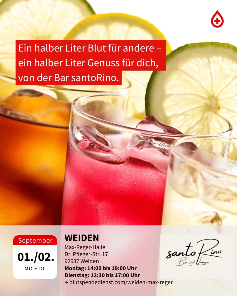 Bei diesem Termin erhält jede Blutspenderin und jeder Blutspender einen Gutschein für ein Getränk in der Bar santoRino in Weiden. Der BRK Kreisverband Weiden und Neustadt/WN sowie der BRK Blutspendedienst bedanken sich recht herzlich bei Betreiber Sandro Hofacker für die Unterstützung.
