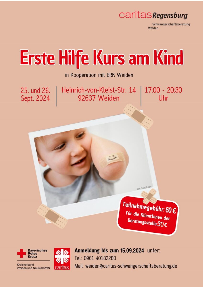 In Kooperation mit dem BRK Weiden-Neustadt bietet die Caritas am 25. und 26. September einen Erste-Hilfe-Kurs speziell für Babys und Kleinkinder an. Der Kurs findet von 17.00 bis 20.30 Uhr statt und umfasst Themen wie Baby- und Kindernotfälle, die Versorgung bedrohlicher Blutungen bei Kindern sowie Erkrankungen im Kindesalter. Die Teilnahmegebühr variiert je nach Klientenstatus zwischen 30 Euro für Klienten der Beratungsstelle und 60 Euro für externe Teilnehmer.