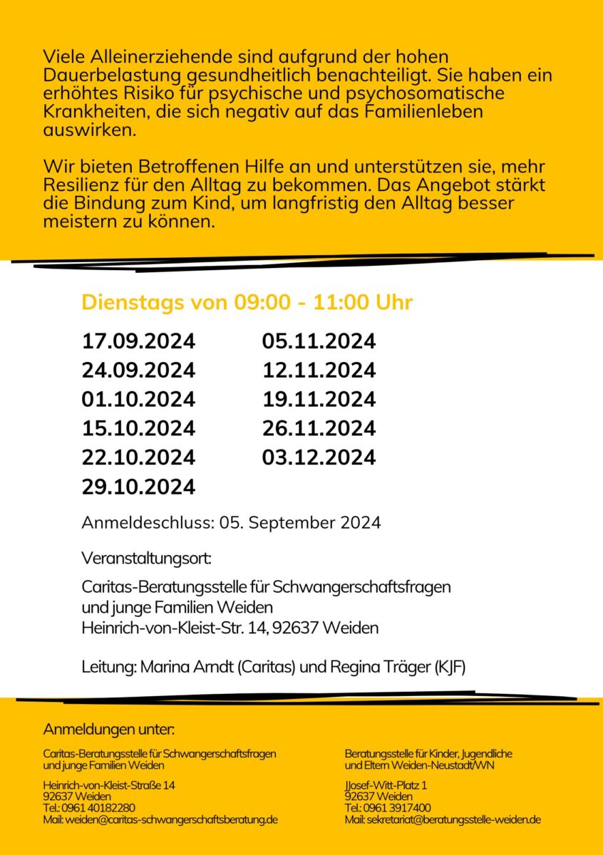 Mit dem Gruppenangebot “Stark trotz Trennung” richtet sich die Caritas an Alleinerziehende mit kleinen Kindern zwischen zwei und sechs Jahren. Das Programm zielt darauf ab, die Teilnehmenden in ihrer Rolle zu stärken und mehr Resilienz für den Alltag zu entwickeln. “Viele Alleinerziehende sind aufgrund der hohen Dauerbelastung gesundheitlich benachteiligt”, erklärt die Caritas. Das Angebot besteht aus insgesamt 11 Terminen, die jeweils dienstags von 9.00 bis 11.00 Uhr stattfinden und durch aufeinander aufbauende Module eine umfassende Unterstützung bieten. Die Kursleitung übernehmen Marina Arndt, Sozialpädagogin bei der Caritas-Beratungsstelle in Weiden, und Regina Träger, Sozialpädagogin bei der Beratungsstelle für Kinder, Jugendliche und Eltern Weiden-Neustadt.