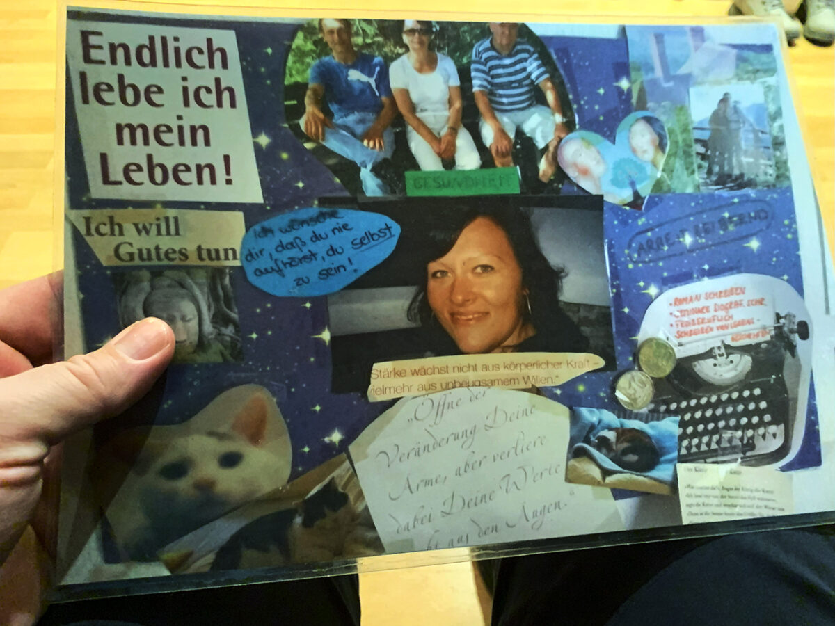 Ihr wird klar: Weder in der Partnerschaft noch in ihrem Beruf ist sie glücklich. „Ich hatte mich im tiefsten Inneren nach etwas Besserem gesehnt – aber wie sollte das Bessere aussehen?“ Sie versucht ihre Sehnsucht bildlich als Collage darzustellen. Das Ergebnis: ein verheiratetes Paar, ein Apfelbaum, zwei Katzen, eine Schreibmaschine, ein Bild von Angehörigen. Einen Platz im Leben finden, mit Hingabe in einer Berufung aufgehen, Geborgenheit in der Partnerschaft, eigene vier Wände, um sich nicht mehr fremd zu fühlen.
