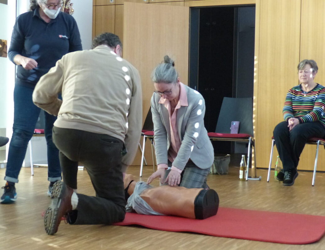 Am Dummy durften sich die Kursteilnehmer beweisen und das in Kürze erlerntes umsetzten. Mit viel Eifer wurde der Ablauf einer Ersten Hilfe, einschließlich der Herz-Druck-Massage durchgeführt. Michaela Reichert war mit dem Eifer der Kursteilnehmer sehr zufrieden. Maria Müller dankte nicht nur der Kursleiterin, sondern auch den Teilnehmern.