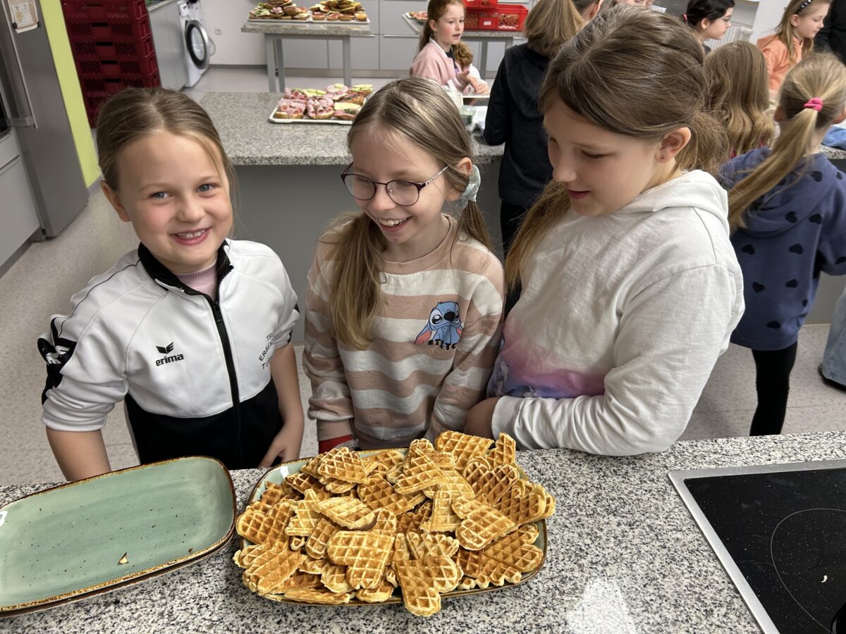 Ein Highlight waren ohne Frage die frisch gebackenen Waffeln. Diese süße Versuchung verteilten insbesondere die Kinder der Klasse 3a mit großer Begeisterung. Es ist nicht nur die Freude am Essen selbst, die dieses Event so besonders macht, sondern auch das gemeinsame Erlebnis und die optische Darbietung des Buffets, die bei den Schülerinnen und Schülern für Begeisterung sorgt.