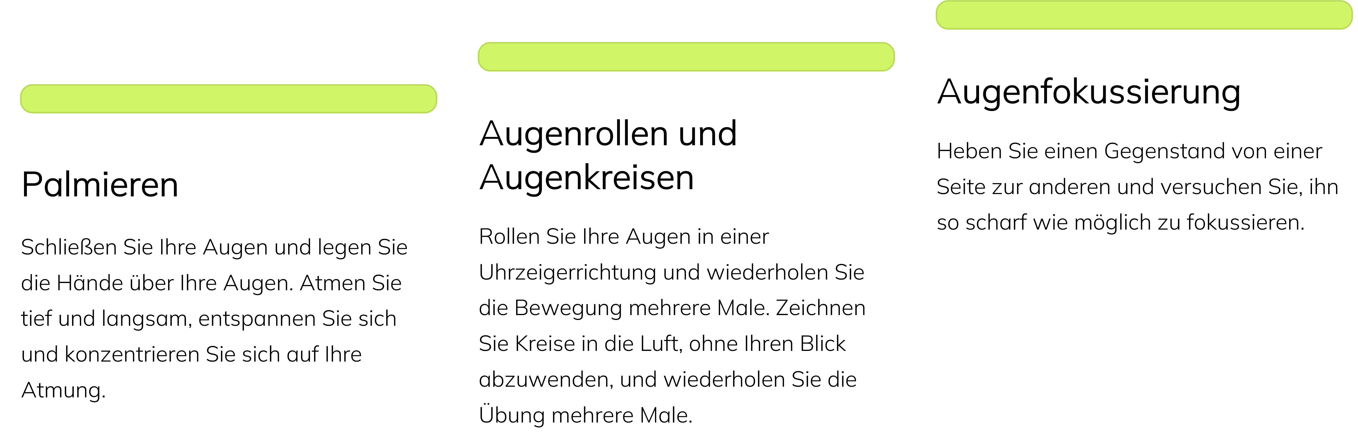 Integrieren Sie bewusst kleine Routinen in Ihren Alltag, die den Augen eine Entspannungspause und “Pflege” gönnen, die sie verdienen.