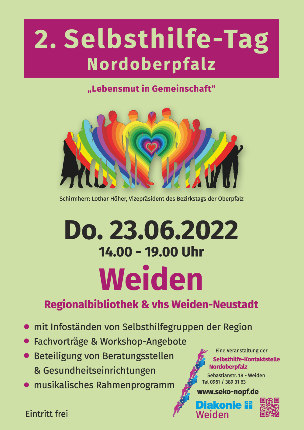 Der große Selbsthilfe-Tag Nordoberpfalz findet am Donnerstag, 23. Juni, von 14 bis 19 Uhr, in der Regionalbibliothek Weiden, sowie in der daneben gelegenen Volkshochschule Weiden statt. Der Eintritt ist frei.