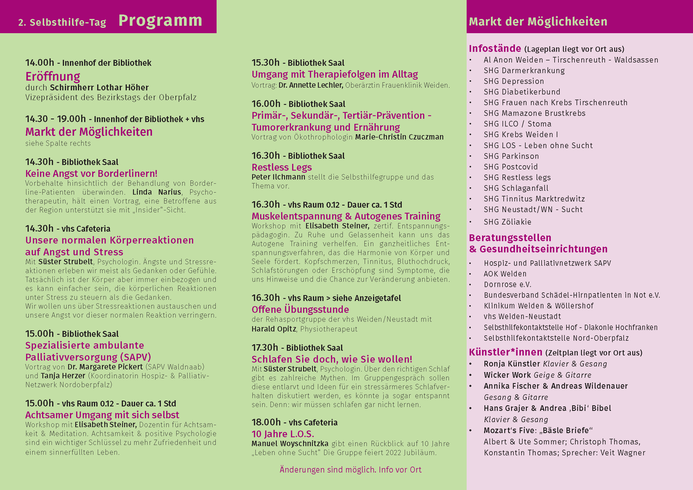 - Die Selbsthilfegruppe „LOS – Leben ohne Sucht“, die in diesem Jahr ihr 10-jähriges Bestehen feiern kann, steuert einen Vortrag bei. Rückblick von Manuel Woyschnitzka.