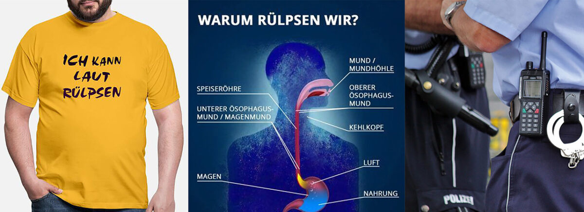 Nicht überliefert ist indes, ob die Beamten auch medizinische Gründe für das absonderliche Verhalten des Mannes in Erwägung gezogen haben. Man darf an dieser Stelle als chronischer Reflux-Patient darauf hinweisen, dass bei fortgeschrittenem Krankheitsbild ein unkontrollierbares Rülpsen nicht zu vermeiden ist. Die wahrscheinliche Ursache: Die langfristige Einnahme von Säureblockern wie Pantoprazol begünstigt eine Fehlbesiedlung des Dünndarms mit Bakterien, die ansonsten von der Magensäure abgetötet würden. Die Folge kann eine eminente Gasentwicklung sein, die in beide Richtungen nur schwer zu kontrollieren ist. Oder im Fachjargon: ein heftiger Ructus!