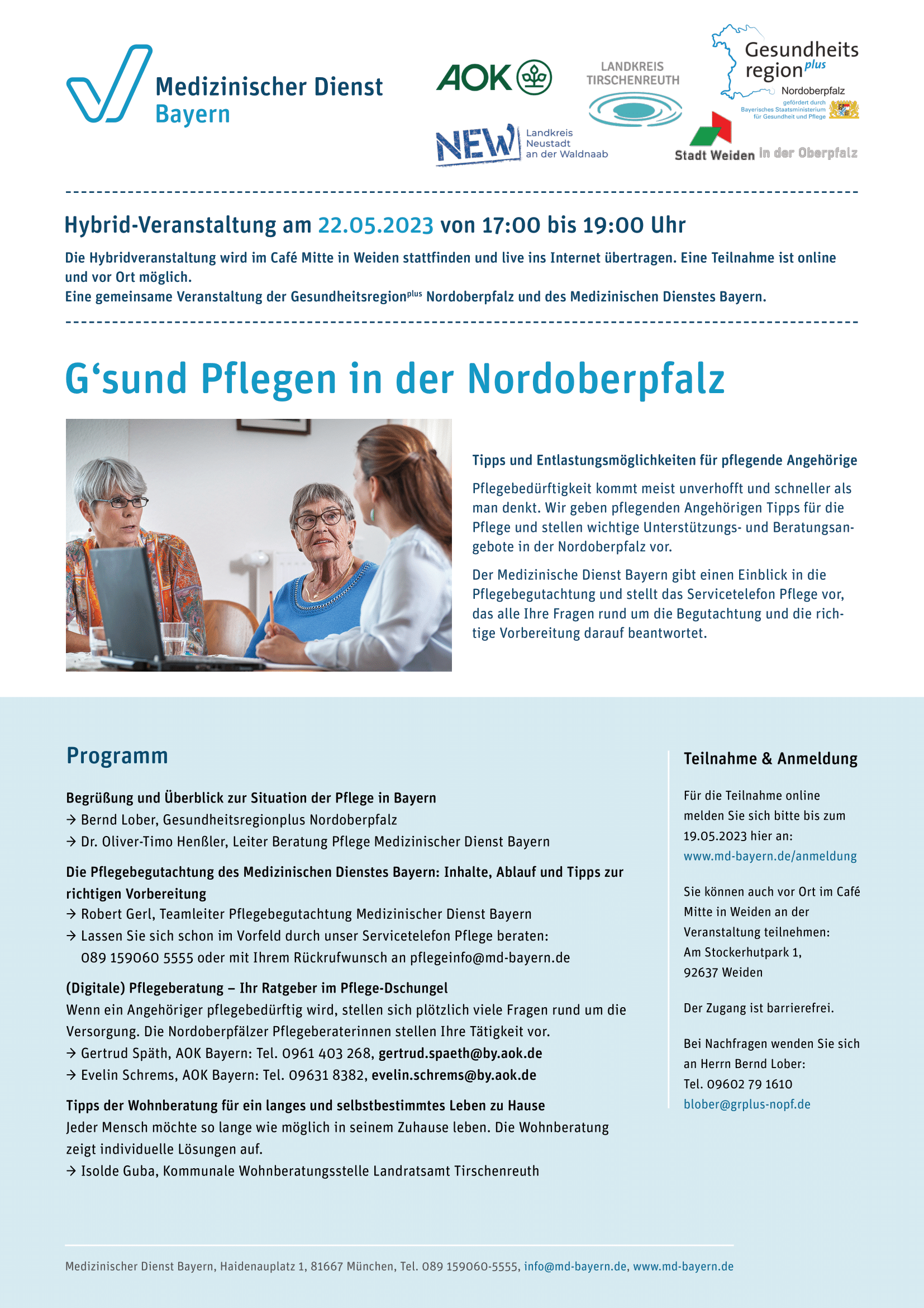 Die “Gesundheitsregion-plus Nordoberpfalz” organisiert zusammen mit dem Medizinischen Dienst Bayern, der Pflegeberatungsstelle Nordoberpfalz, der AOK und der Wohnberatungsstelle Tirschenreuth eine Hybridveranstaltung „G´sund Pflegen in der Nordoberpfalz“. Diese findet am 22. Mai von 17 bis 19 Uhr im Café Mitte in Weiden statt und wird live ins Internet übertragen.