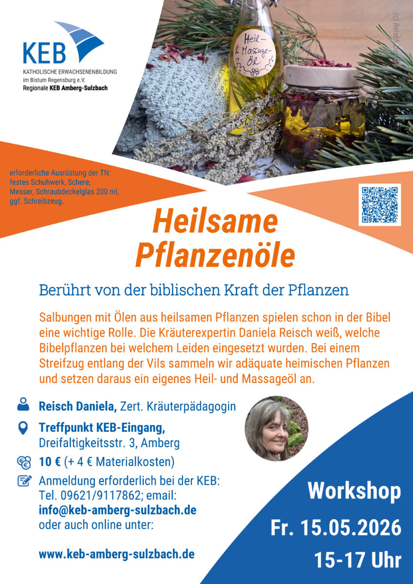 Amberg. Am Freitag, den 15. Mai 2026, lädt die KEB Amberg-Sulzbach zu einem Workshop über heilsame Pflanzenöle und ihre biblische Bedeutung ein. Mit Daniela Reisch geht es von 15 bis 17 Uhr entlang der Vils; Treffpunkt: KEB.