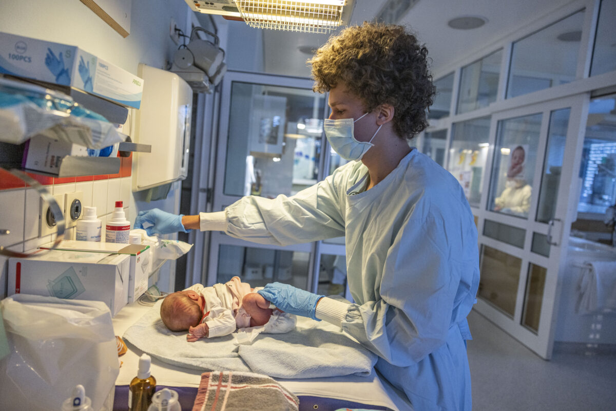 Ausziehen, wiegen, waschen, Temperatur messen, anziehen, füttern. René empfindet seine Aufgabe auf der Säuglingsstation als “sehr spannend und abwechslungsreich”. Vorsichtig nimmt er “sein Kind”, die “süße Maus”, aus dem Bettchen, hält das Mädchen liebevoll im Arm und spricht leise mit ihr. “Ich liebe es, mit Kindern zusammenzuarbeiten. Es macht mir einfach mehr Spaß.”