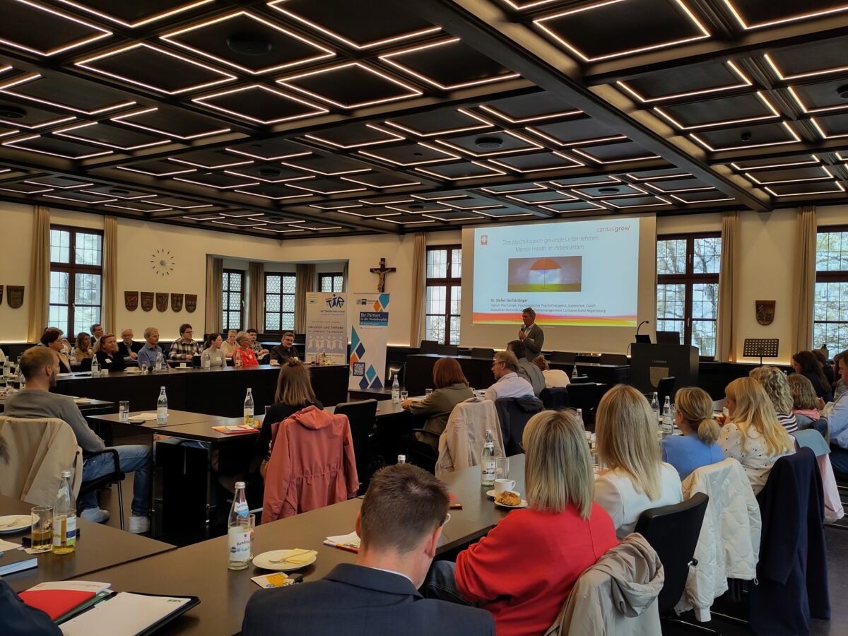 In der Keynote von Dr. Stefan Gerhardinger, dem Leiter der Stabsstelle betriebliches Gesundheitsmanagement des Caritasverbandes Regensburg, ging es um gesundheitliche und wirtschaftliche Daten, die Möglichkeiten des betrieblichen Gesundheitsmanagements im Bereich mentale Gesundheit und das Angebot caritasGROW. Die Zahl der psychischen Erkrankungen und die Ausfalltage steigen seit Jahren an. Die Berufsfelder Pädagogik und Gesundheitswesen sind stärker betroffen als Verwaltung oder technische Berufe. Dennoch tritt das Phänomen branchenübergreifend auf. Betriebliches Gesundheitsmanagement ist an dieser Stelle kein „nice to have“ mehr, sondern ein wichtiger Baustein und zur Senkung der Fehlzeiten in der Belegschaft ein bedeutsamer wirtschaftlicher Faktor.