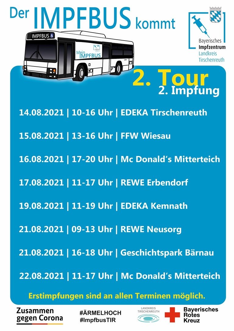 Der Landkreis Tirschenreuth setzt weiter auf möglichst schnellen und einfachen Zugang zu einer Corona-Impfung. Nach dem erfolgreichen Start des Impfbusses vor drei Wochen soll dieser am Samstag (14.08.2021) erneut unterwegs sein – auf der gleichen Route wie beim ersten Mal. „Dies liegt daran, dass dadurch jeder, der sich vor drei Wochen im Impfbus impfen hat lassen, nun die Möglichkeit hat, sich am selben Ort die Zweitimpfung abzuholen“, erklärt Holger Schedl, BRK Kreisgeschäftsführer. „Aber selbstverständlich sind wir auch bestens für Erstimpfungen gerüstet, so dass weiterhin jeder der sich impfen lassen möchte, herzlichen willkommen ist.“