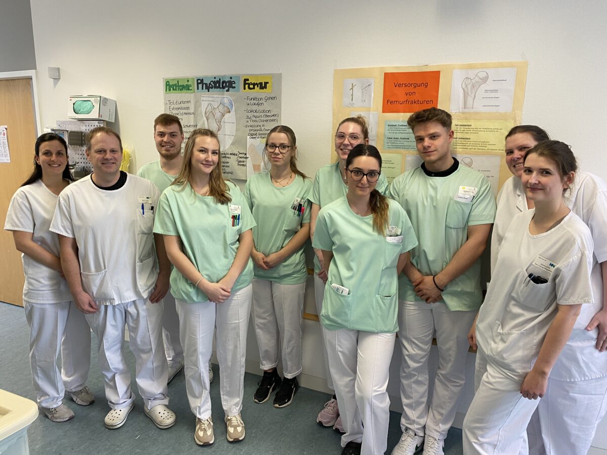 Dafür kamen auch Oberarzt Dr. Maximilian Baier, die Fachoberärzte Matthias Schnabl und Dr. Christoph Schirdewahn, Dr. Sarka Hoppe und Dr. David De Leon auf die Station und gaben dabei einen Einblick in Endoprothetik, Naht-Techniken oder das Verhalten in Notfallsituationen.