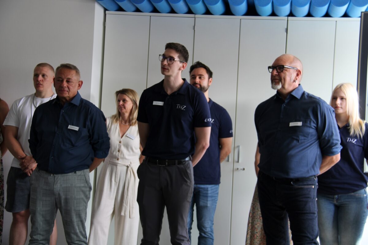 Die beiden THZ-Chefs Helmut Kick und Bernhard Spachtholz, sowie ihr designierter Nachfolger und Betreiber des Premium-Fitnessstudios Re-Nova, Aaron Kopornyai, begrüßten die Gäste zum offiziellen Eröffnungsteil im neuen Kursraum. Das Interesse war riesig, denn der Raum konnte die gut 100 Gäste kaum fassen.
