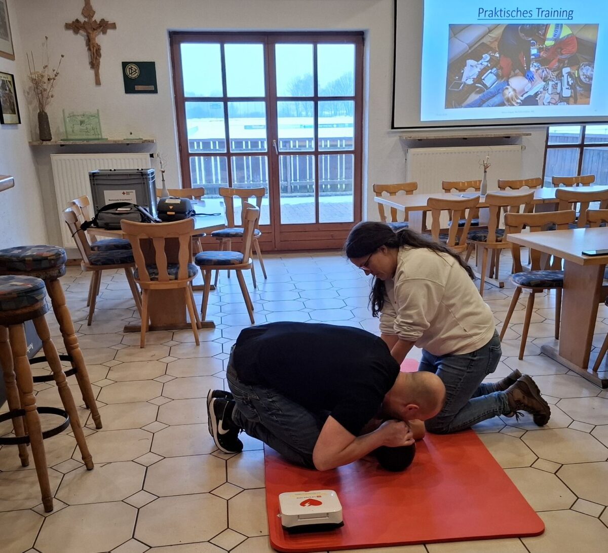 Nicht nur einer, sondern gleich drei zentral verteilte und frei zugängliche Defibrillatoren (AED) stehen in Eslarn zur Verfügung und unterstützen Ersthelfer dabei, im Ernstfall Leben zu retten. Die öffentlich zugänglichen Geräte befinden sich am Hintereingang des Sportzentrums, bei der Sparkasse sowie am Feuerwehrhaus. Durch diese strategisch gewählten Standorte kann wertvolle Zeit bis zum Eintreffen eines Notarztes und der geschulten BRK-Helfer eingespart werden – ein entscheidender Faktor bei einem Herz-Kreislauf-Stillstand. Um Berührungsängste abzubauen und Sicherheit im Umgang mit den lebensrettenden Geräten zu vermitteln, wurde auf Einladung der Quartiermanagerin Petra Brenner und der Ersthelferin vor Ort (HvO) Corinna Völkl eine kostenlose Einweisung im TSV-Sportheim angeboten. Als Referent konnte der erfahrene Notfallsanitäter und Dozent im Rettungsdienst, Marco Rappl aus Moosbach, gewonnen werden.