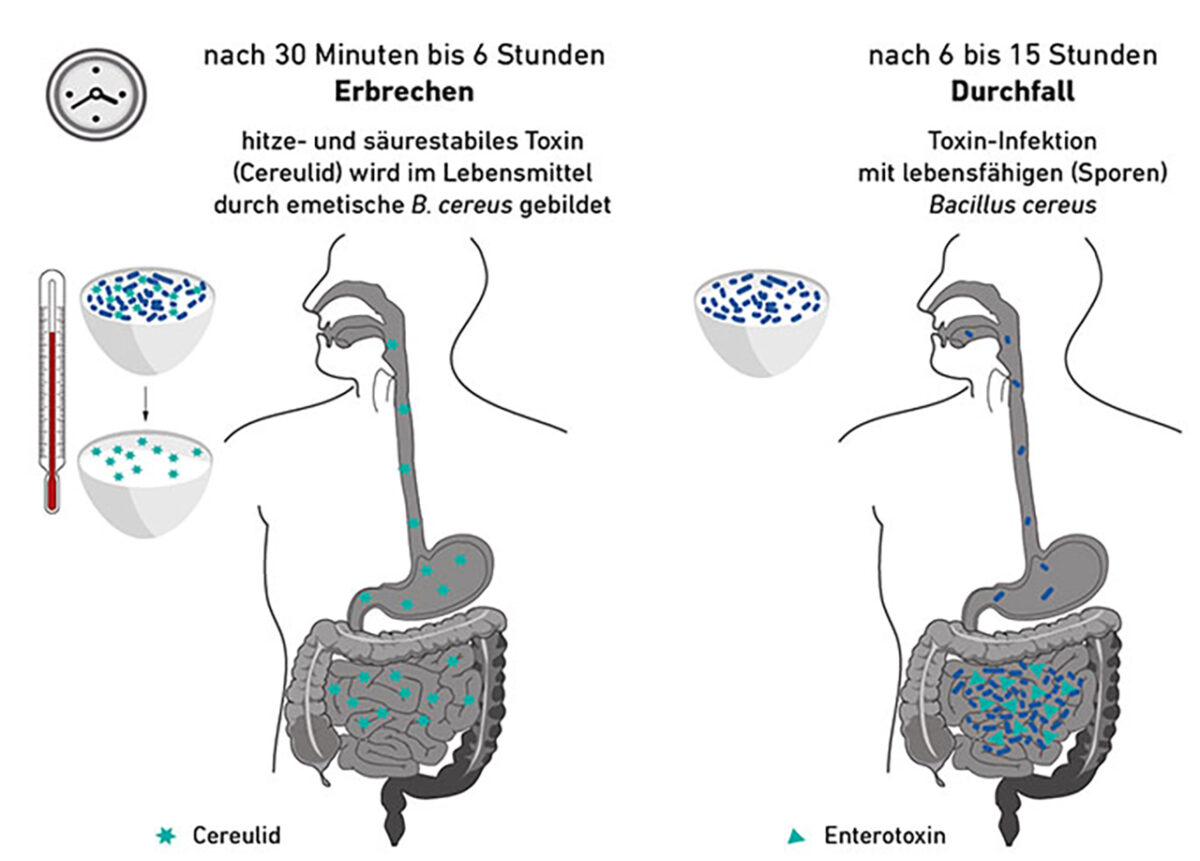 Stünden diese ein paar Stunden oder gar Tage ohne Kühlung in der Küche, habe das Bakterium genügend Zeit, um sich zu vermehren. Beim Erhitzen würden zwar einige Sporen absterben, aber nicht alle. Die übriggebliebenen vermehrten sich im Anschluss bei Temperaturen zwischen 10 und 50 Grad weiter. Nehme man große Mengen Sporen auf, habe man in der Regel mit Bauchschmerzen, Übelkeit und Durchfall zu kämpfen.