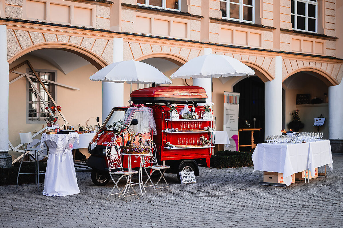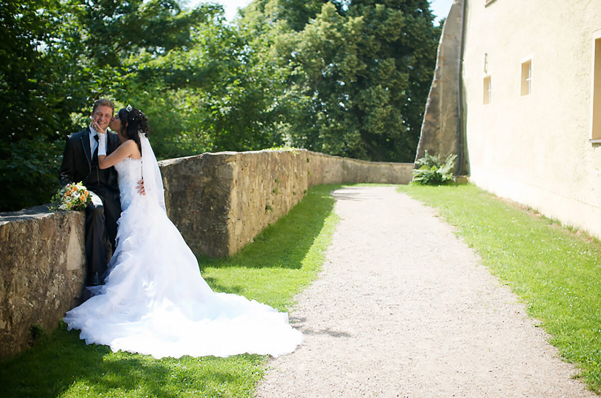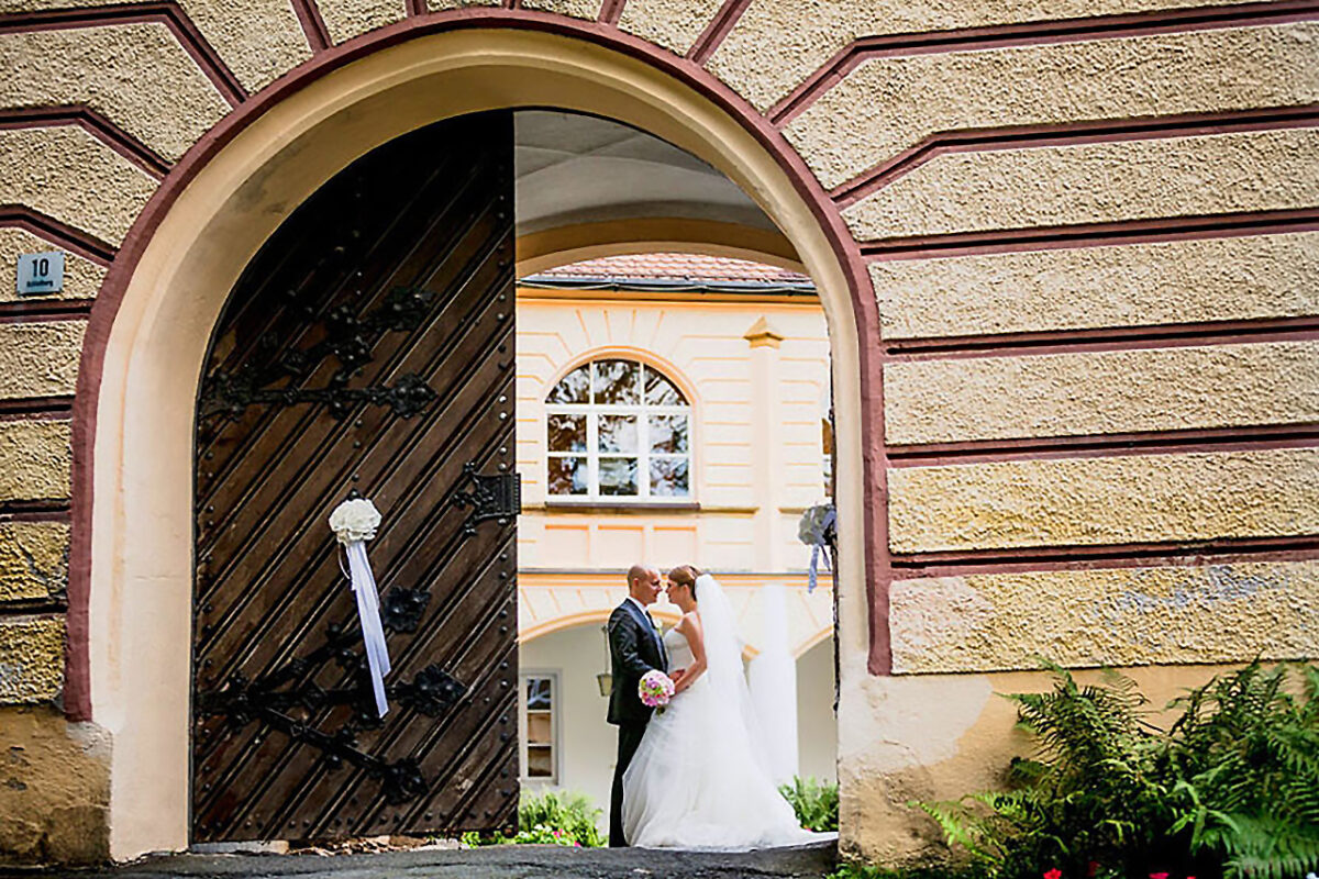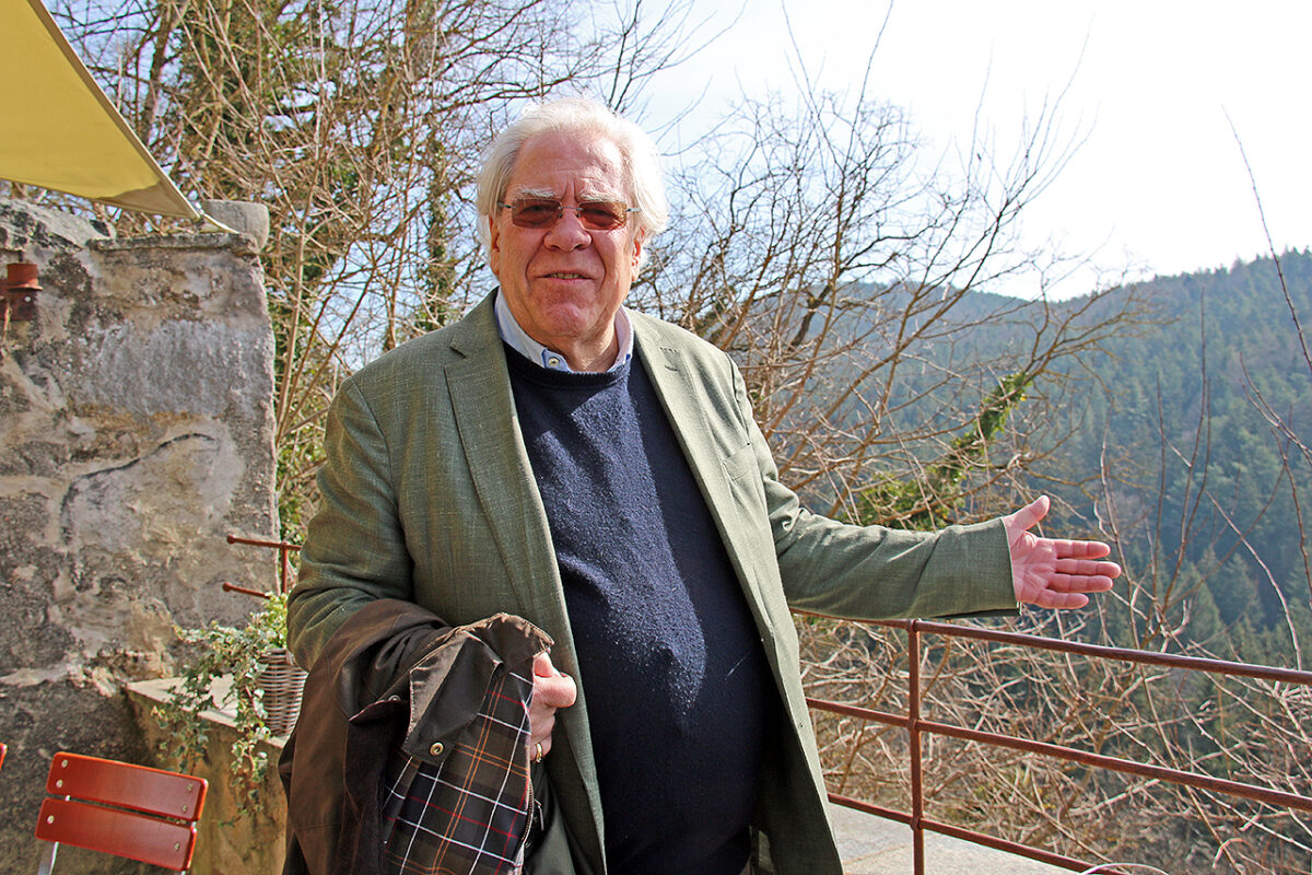 Auf dem leicht ansteigenden Weg vorbei an der romantisierenden, zinnenbewehrten Burgmauer aus dem 19. Jahrhundert, auf dem immer wieder scherzende junge Model-Bräute vorbeischlendern und selbstverliebt Selfies schießen, öffnet sich nach der Passage des Portals ein Blick in den sonnigen Arkadenhof: „Herrlich“, seufzt der Graf zufrieden, „so ein schönes Wetter“. Die Offerte eines Glases Sekt lehnt er dankend ab: „Ich mache gerade eine Diät“, erklärt er und steuert auf den Trakt mit dem Trausaal, einigen schmucken Zimmern für Übernachtungsgäste und der Wohnung seines Sohnes zu.