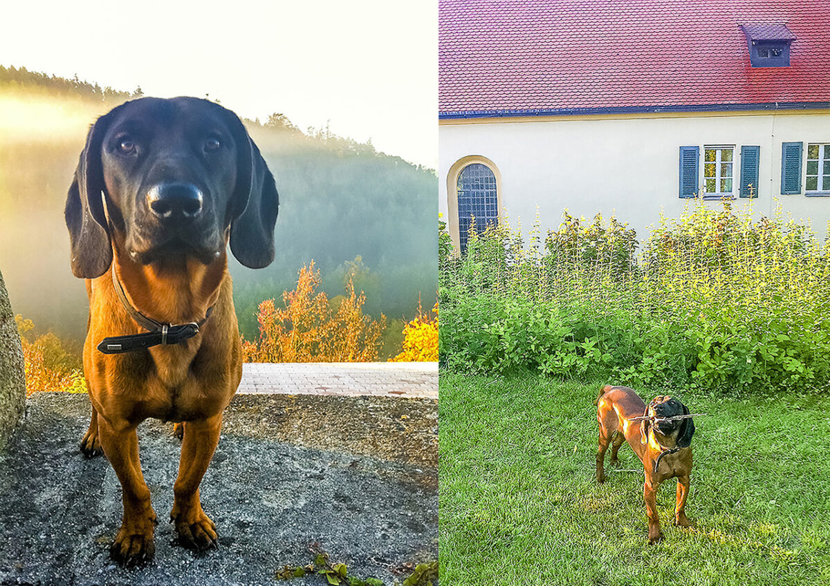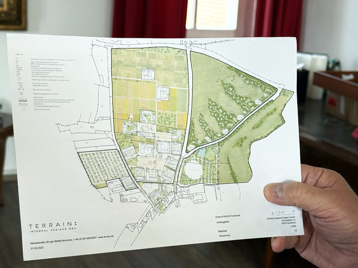 Ein letzter Abstecher durch die Absperrung hinunter zur Privatwohnung des Grafen, wo uns die Lebensgefährtin und der neugierige Schlosshund Timo, ein brauner Gebirgsschweißhund, entgegentrotten. Ein großes Hallo, „ja, wir gehen gleich gemeinsam durch“, vertröstet der Graf, „ich will dem Herrn nur noch den Entwurf für unser Ko-Dorf des Landschaftsarchitekten Klaus Loenhart zeigen.“ Das neueste Projekt des Grafen ist eine echte Herzensangelegenheit.