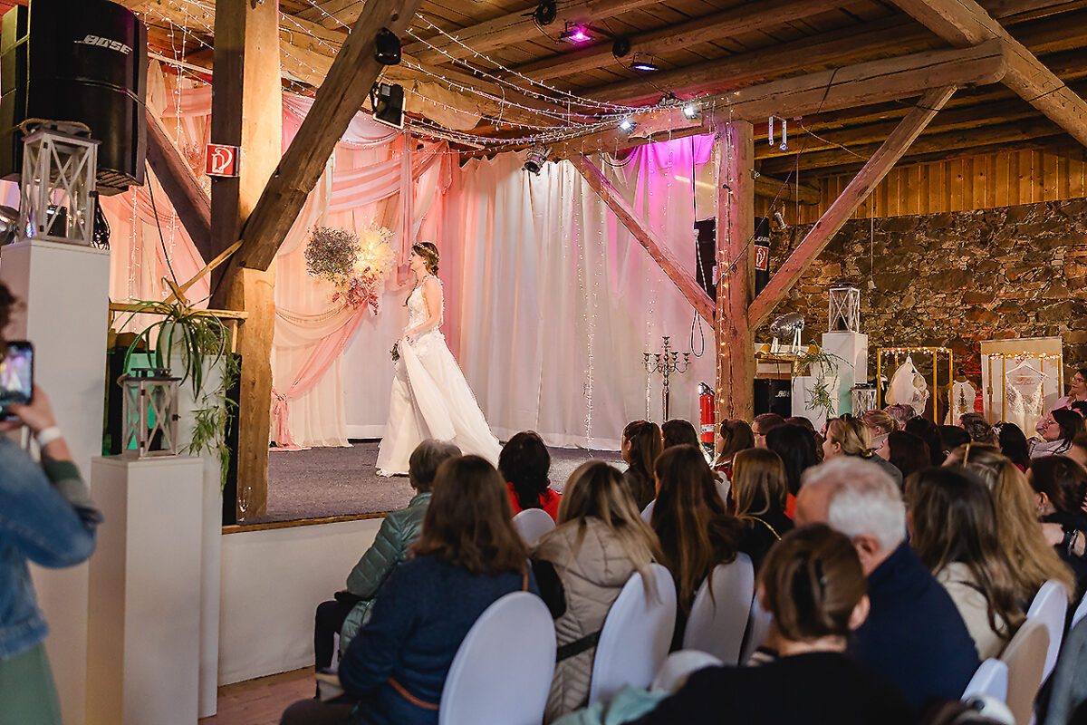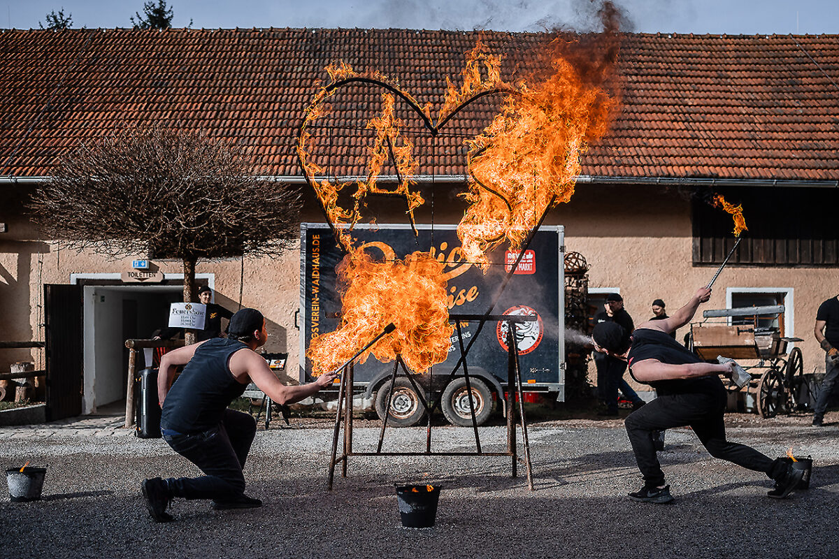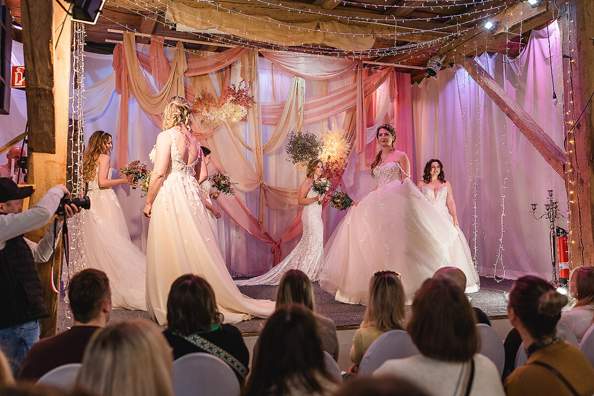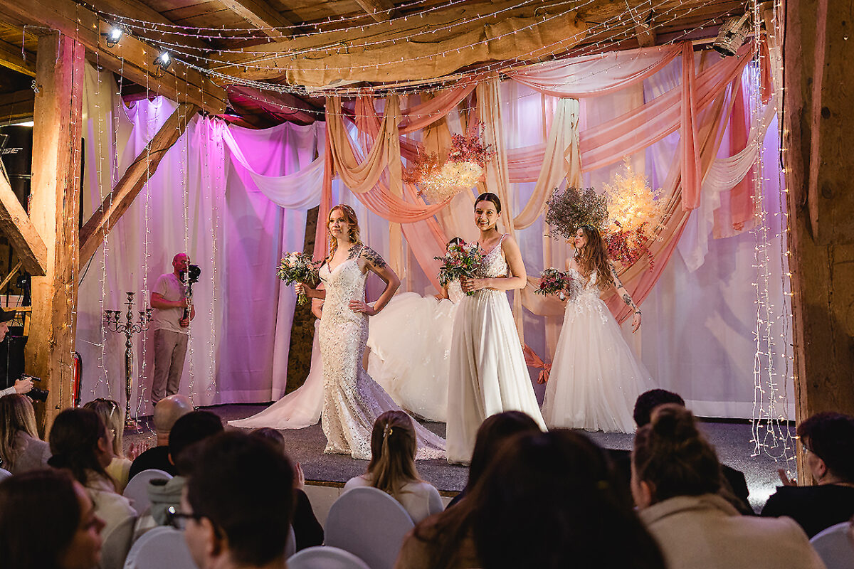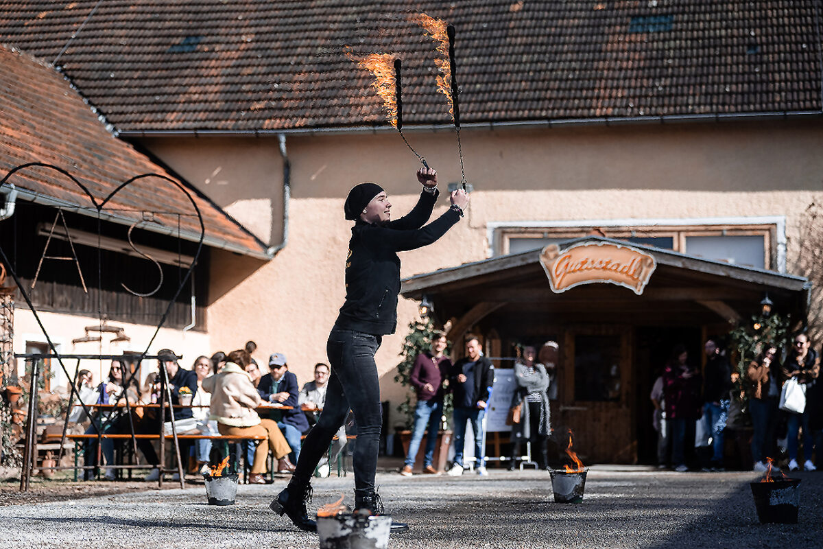 Auf der Bühne des Stadls flanieren jetzt elegante Braumodels, recken und strecken sich, dass es eine Freude für Thomas Tuchel, den Übungsmeister des Streckens, wäre, um ihre bauschigen Kleider zum Rauschen zu bringen. Ein Meer aus Seide, Tüll und Spitze. Auch die Hälse des Publikums recken sich, um kein Detail zu verpassen. Im Hof vor dem nostalgischen VW-Bus, Baujahr irgendwann in den 1970er Jahren, turnen Feuerschlucker mit ihren Fackeln und bringen nicht nur Kinderaugen zum Leuchten.