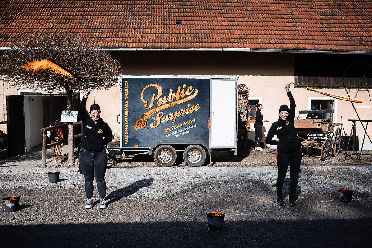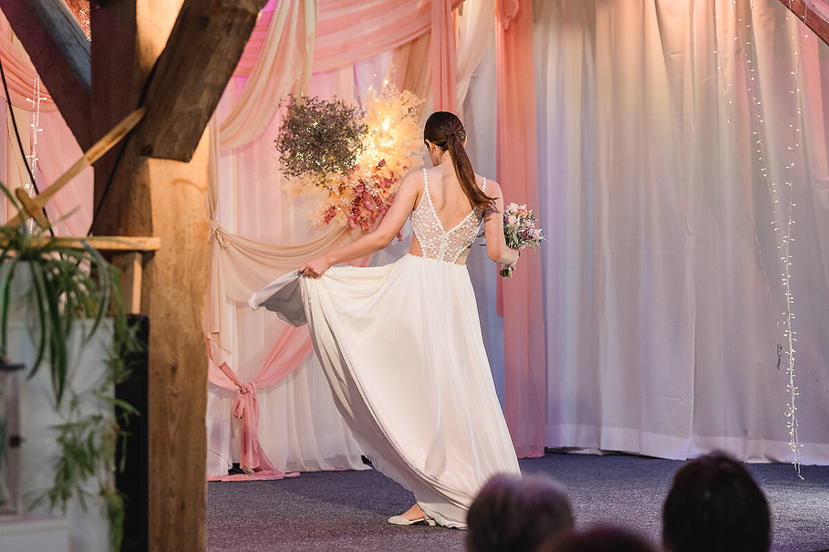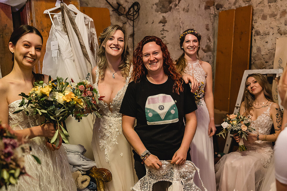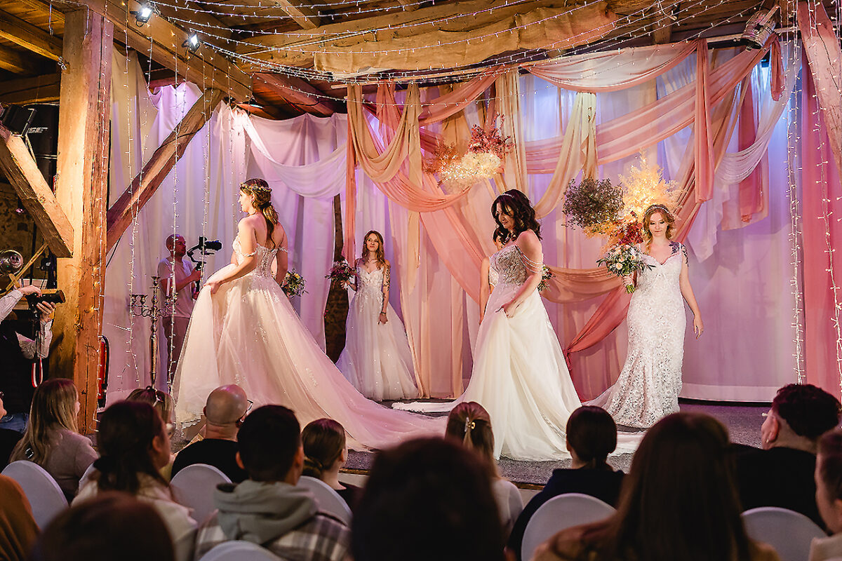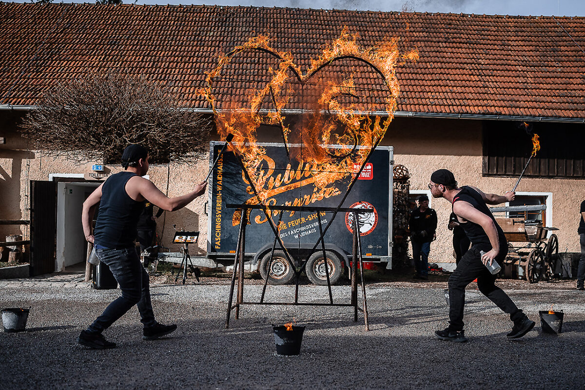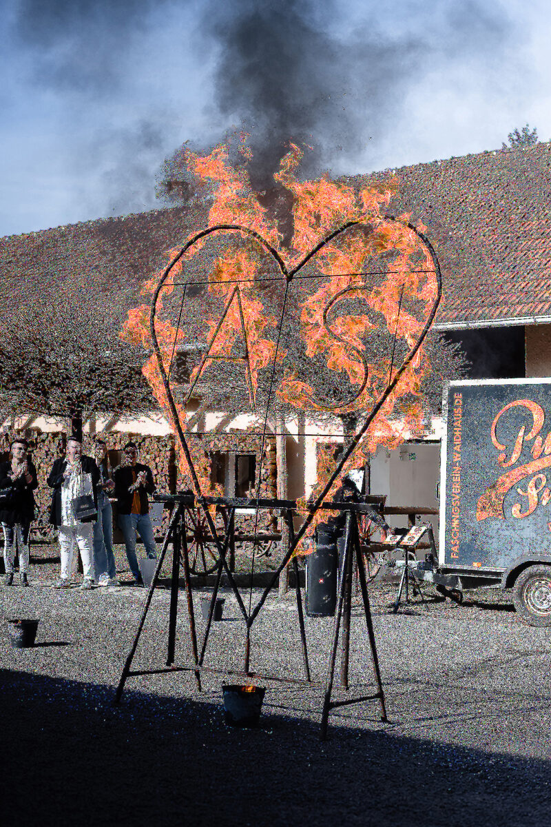 Auf der Bühne des Stadls flanieren jetzt elegante Braumodels, recken und strecken sich, dass es eine Freude für Thomas Tuchel, den Übungsmeister des Streckens, wäre, um ihre bauschigen Kleider zum Rauschen zu bringen. Ein Meer aus Seide, Tüll und Spitze. Auch die Hälse des Publikums recken sich, um kein Detail zu verpassen. Im Hof vor dem nostalgischen VW-Bus, Baujahr irgendwann in den 1970er Jahren, turnen Feuerschlucker mit ihren Fackeln und bringen nicht nur Kinderaugen zum Leuchten.