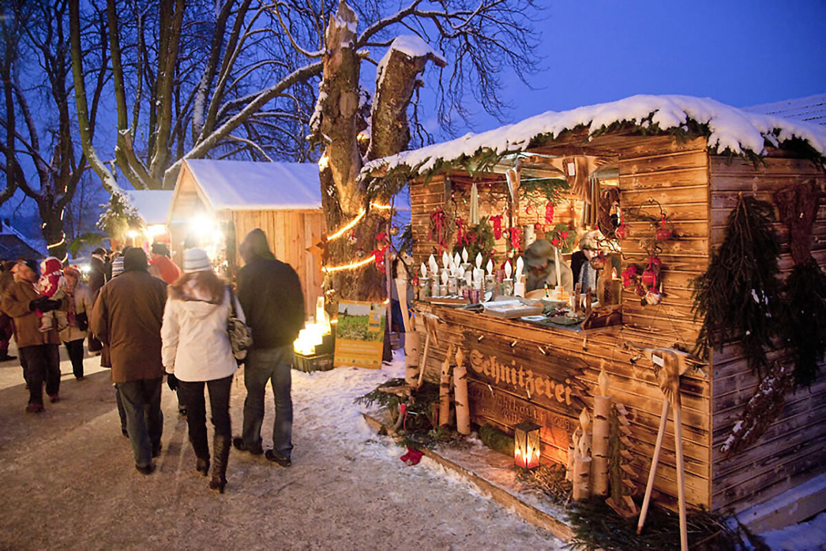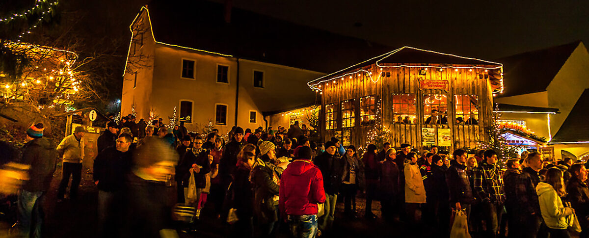 Auf dem Weg zurück zum Stadl werfen wir einen Blick durch Äste und Zweige auf den festinstallierten Budenzauber des Weihnachtsmarkts, der sich romantisch wie einst in Hexenagger an den bewaldeten Pfadrand zum Stadl hinab schmiegt. „Von Hexenagger habe ich viel gelernt“, greift der Graf den Vergleich auf. „Ich hatte Eberhard Leichtfuß auch angeboten, dass wir zusammenzuarbeiten.“ Das Ergebnis ist bekannt. Der Markt in Hexenagger ist Geschichte – wegen der Reibereien mit den Anwohnern.
