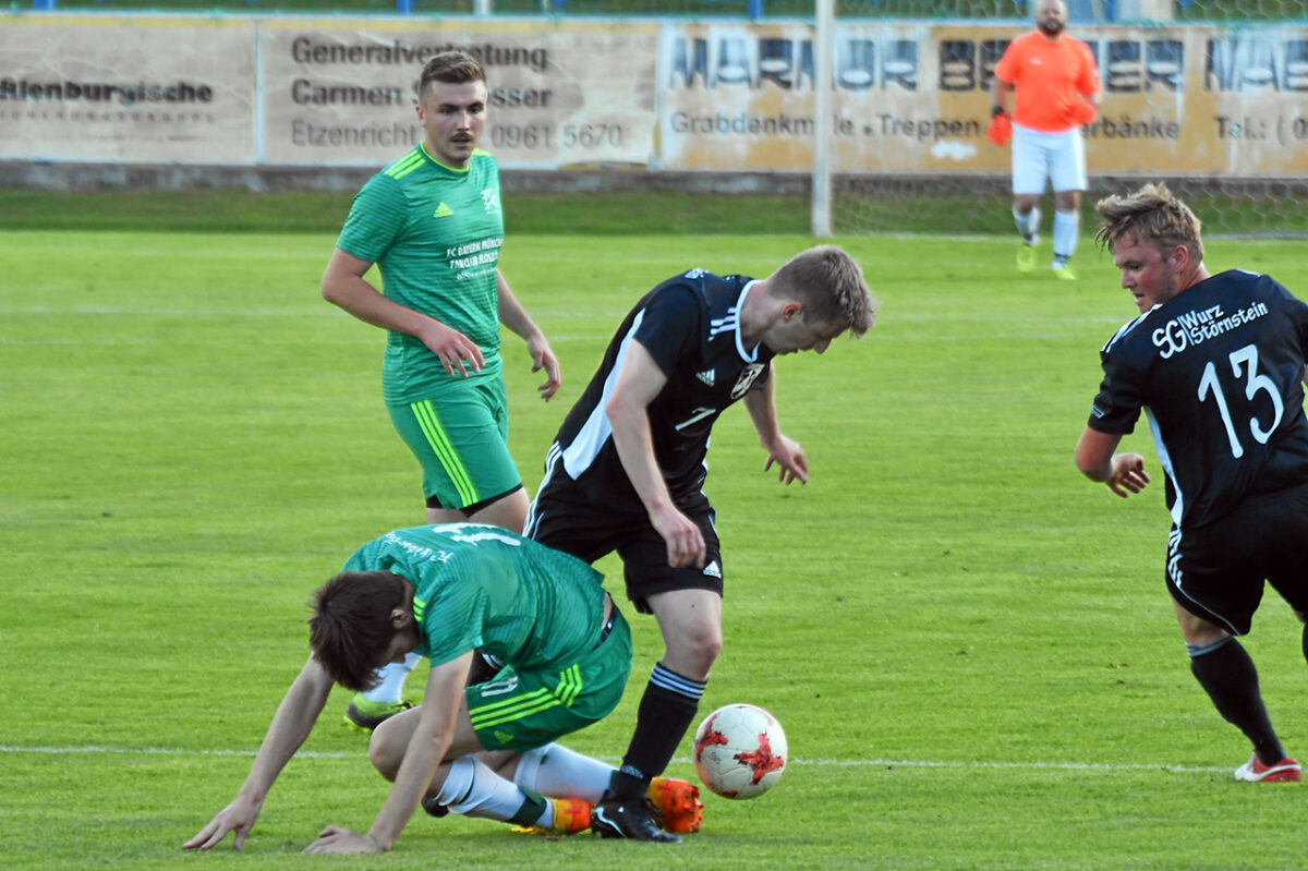 Schiedsrichter Andreas Betzl pfeift die Partie bei bestem Fußballwetter auf dem Platz des SV Etzenricht pünktlich an. 310 Zuschauer erwarten eine ausgeglichene Partie. Doch bereits nach fünf Minuten muss Weidens Keeper Denis Strohbach erstmals eingreifen. In der 13. Spielminute ist er dann machtlos, als Simon Bösl zur Führung für die SG abstaubt.