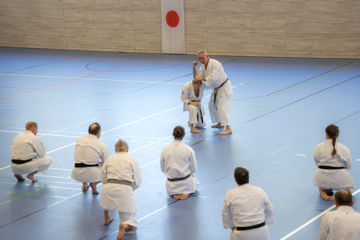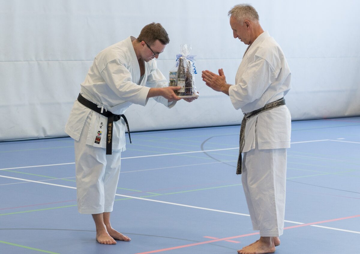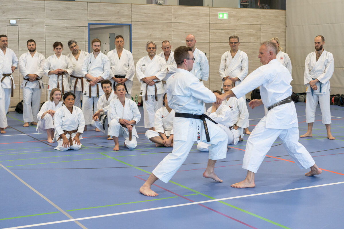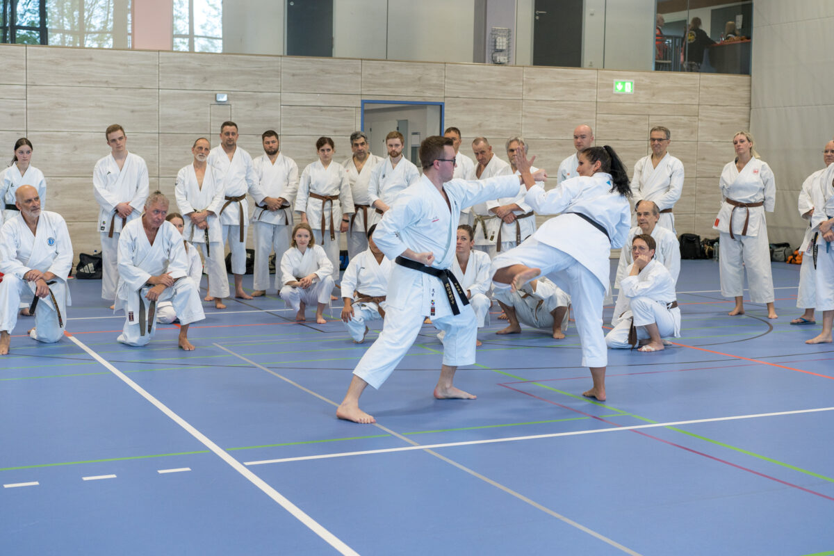 Die Teilnehmer wurden gegen Ende von Körber durch das Kumite (Partnertraining) geführt, wo man sich richtig verausgaben konnte. Sprungübungen im Rhythmus des Partners sowie Jiyu Kumite und Jiyu Ippon Kumite standen auf dem Programm. Die Vorbereitung war wieder ein voller Erfolg, der allen Teilnehmern große Freude bereitete. Der Verein dankte allen Helfern und vor allem dem Dojo-Leiter Marcel Bieber und Helmut Körber als leitendem Referenten.