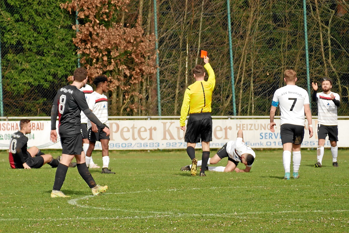 Die Partie am Sonntagnachmittag fand mit dem Spielabbruch nach circa einer Stunde ein jähes Ende. Bereits nach wenigen Minuten fiel ein Zuschauer auf, der vom Unparteiischen Dominik Zawal des Sportplatzes verwiesen wurde. Nachdem sich alle wieder auf den Fußball konzentriert hatten, gab es in der ersten Halbzeit keine Treffer. Nach dem Seitenwechsel ging der Tabellenführer durch einen Elfmeter von Julian Deubzer in Führung. Roman Herman (Neustadt) bekam dabei auch eine Zeitstrafe. Als einige Minuten später die Neustädter Serhat Mamhaji und gleich danach Jiri Prchal die Rote Karte sahen, rannte besagter Zuschauer plötzlich auf das Spielfeld und ging auf Pirker Spieler los. Daraufhin brach der Schiedsrichter das Spiel ab.