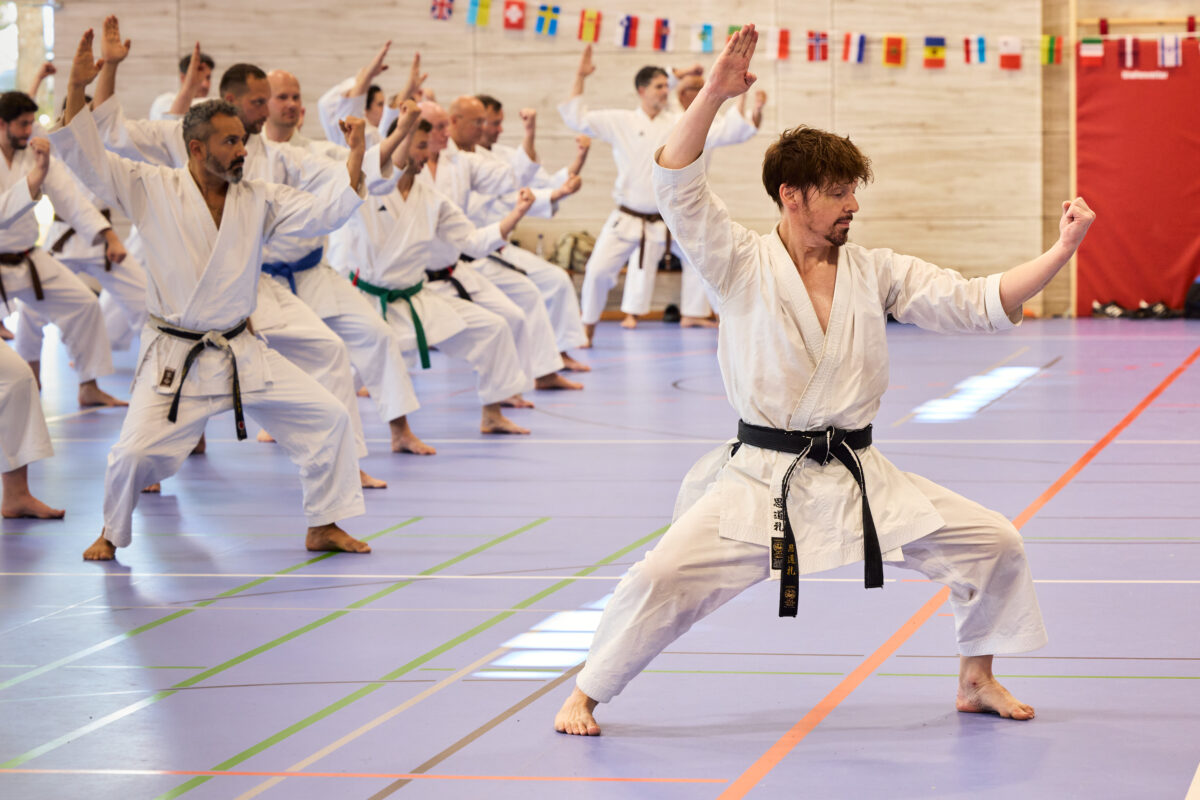 Im Zentrum des Seminars standen zunächst grundlegende Techniken, auf die Shihan Bertel immer wieder besonderen Wert legte. Nur durch konsequentes Arbeiten an der Basis kann Karate seine volle Wirkung entfalten. Diese Techniken wurden im Anschluss in zahlreichen Partnerübungen vertieft und mit großem Fokus auf Präzision und Kontrolle geübt. Er betonte immer wieder die Bedeutung von Unmittelbarkeit in der Bewegung – keine überflüssigen Bewegungen, keine Umwege. Alles muss direkt, präzise und mit maximaler Effektivität erfolgen. Besonders eindrucksvoll war, wie Bertel immer wieder Bezüge zu verschiedenen Katas herstellte und damit zeigte, dass die grundlegenden Prinzipien des Karate überall wiederzufinden sind.