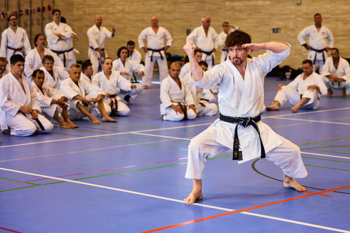 Ein Höhepunkt des Seminars war die intensive Arbeit an der Meisterkata „Rōshu“ (jap. 浪手 – „Wellenhand“), die von Asai Tetsuhiko Sensei selbst entwickelt wurde. Diese anspruchsvolle Kata kombiniert komplexe Techniken, Rotationen, Hüftmanipulationen sowie den Wechsel zwischen fließenden und explosiven Bewegungen. Sie ist ein Paradebeispiel für Asais Stil: kreisförmig, flexibel, kraftvoll. Die Anwendung dieser Kata zeigte Bertel in zahlreichen realitätsnahen Partnerübungen, die mit großem Engagement trainiert wurden. Dabei wurde deutlich, wie wichtig ihm es ist, die ursprüngliche Form des Karate von Asai Sensei unverfälscht und mit Tiefe weiterzugeben – kein Sport-Karate, sondern ehrliches Budo.