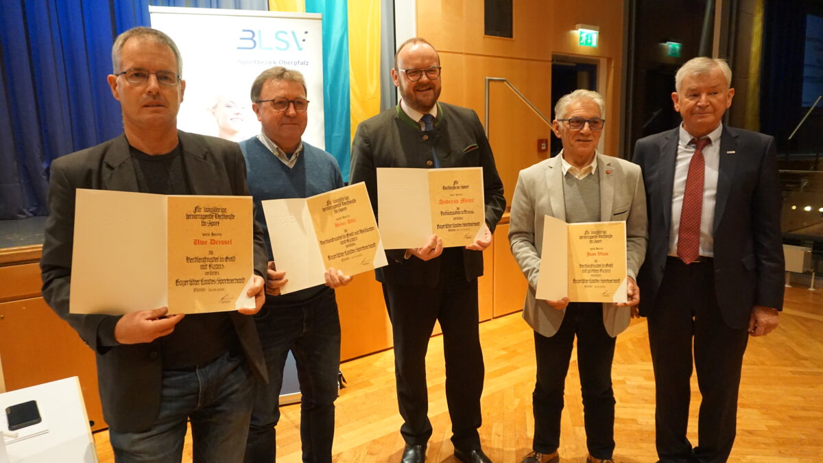 Der scheidende Vorsitzende ehrte zusammen mit BLSV-Präsident Jörg Ammon vier verdiente Persönlichkeiten: Landrat Andreas Meier für seine Verdienste um den Sport im Landkreis mit der Verdienstplakette in Bronze sowie Heinz Uhl (Vorsitzender RSV Concordia Windischeschenbach und Radsport-Bezirksvorsitzender), Juan Villas (Vorsitzender ASV Neustadt/WN) und Uwe Dressel (Vorsitzender der TG Neunkirchen) mit der Verdienstnadel in Gold.
