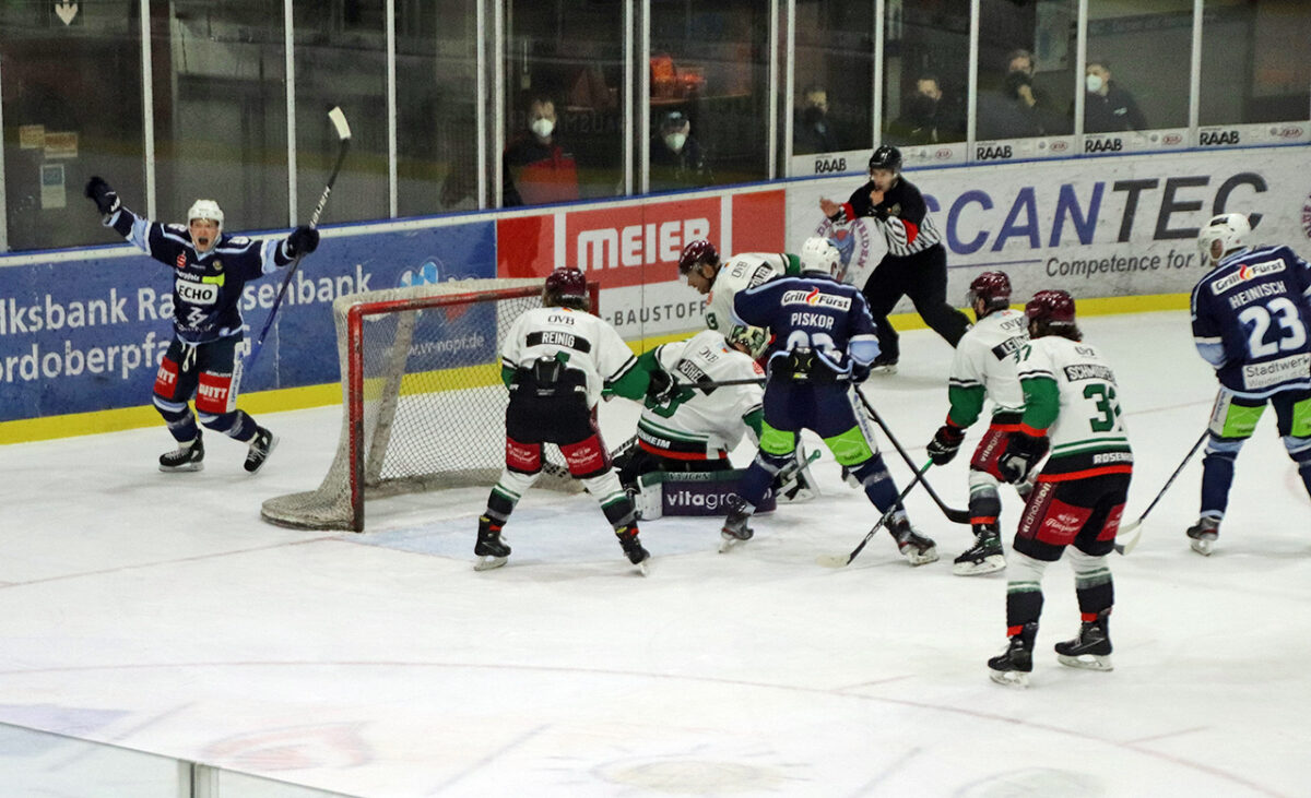 Der Spitzenreiter startet schwungvoll, setzt mit schnellen Angriffen die Gäste vom Mangfall unter Druck. Nach drei Minuten bereits erste gute Einschussmöglichkeiten. Doch die Gäste stellen sich schnell auf die Weidener Attacken ein, kaufen den Blauen mit zunehmender Spieldauer mit körperbetontem Spiel den Schneid ab. Mit Folgen: Bei angezeigter Strafzeit schiebt Dominik Draxlberger die Scheibe an Jaroslav Hübl vorbei ins Tor, der 0:1-Führungstreffer für die Gäste (6.).