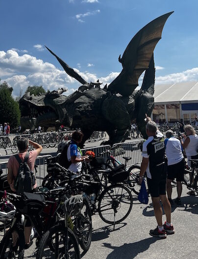 “Am Sonntag ging es entspannte 600 Höhenmeter und 90 Kilometer ab Cham in einer Schleife zurück nach Cham zur ersten Wasserpause. Wasser und Bananen halfen, den Akku bis zur Mittagspause wieder aufzuladen. Mittagspause war in Furth im Wald beim “Drachen”, dem größten Schreitroboter der Welt. Mit leichter Kost oder mit deftigem Gyros ging es dann wieder zurück nach Cham. Tags zuvor gab es noch eine Willkommensparty des Bayerischen Rundfunks mit allen Verantwortlichen und Teilnehmern. Begrüßt wurden wir dabei vom Cheforganisator der Tour, Wolfgang Slama. Heute starten wir in Richtung Landau an der Isar.”