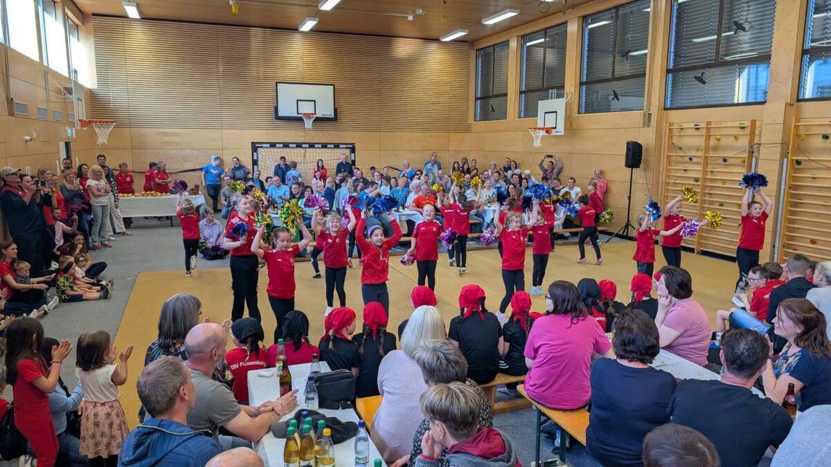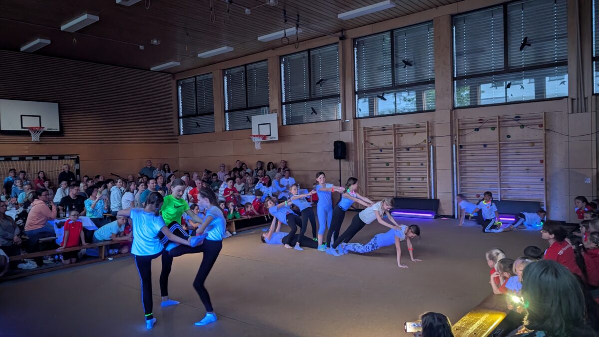 Im Anschluss eroberten die „Puschelladies“ die Turnmatte: Mädchen im Alter von sechs bis zehn Jahren zeigten mit bunten Pompons eine schwungvolle Choreografie. Es folgte die Gruppe der zehn- bis 14-jährigen Mädchen, die mit einer technisch anspruchsvollen Übung am Stufenbarren ihr turnerisches Können unter Beweis stellte. Auch eine beeindruckende Show mit Schwarzlicht zog alle Blicke auf sich und hinterließ bleibenden Eindruck.