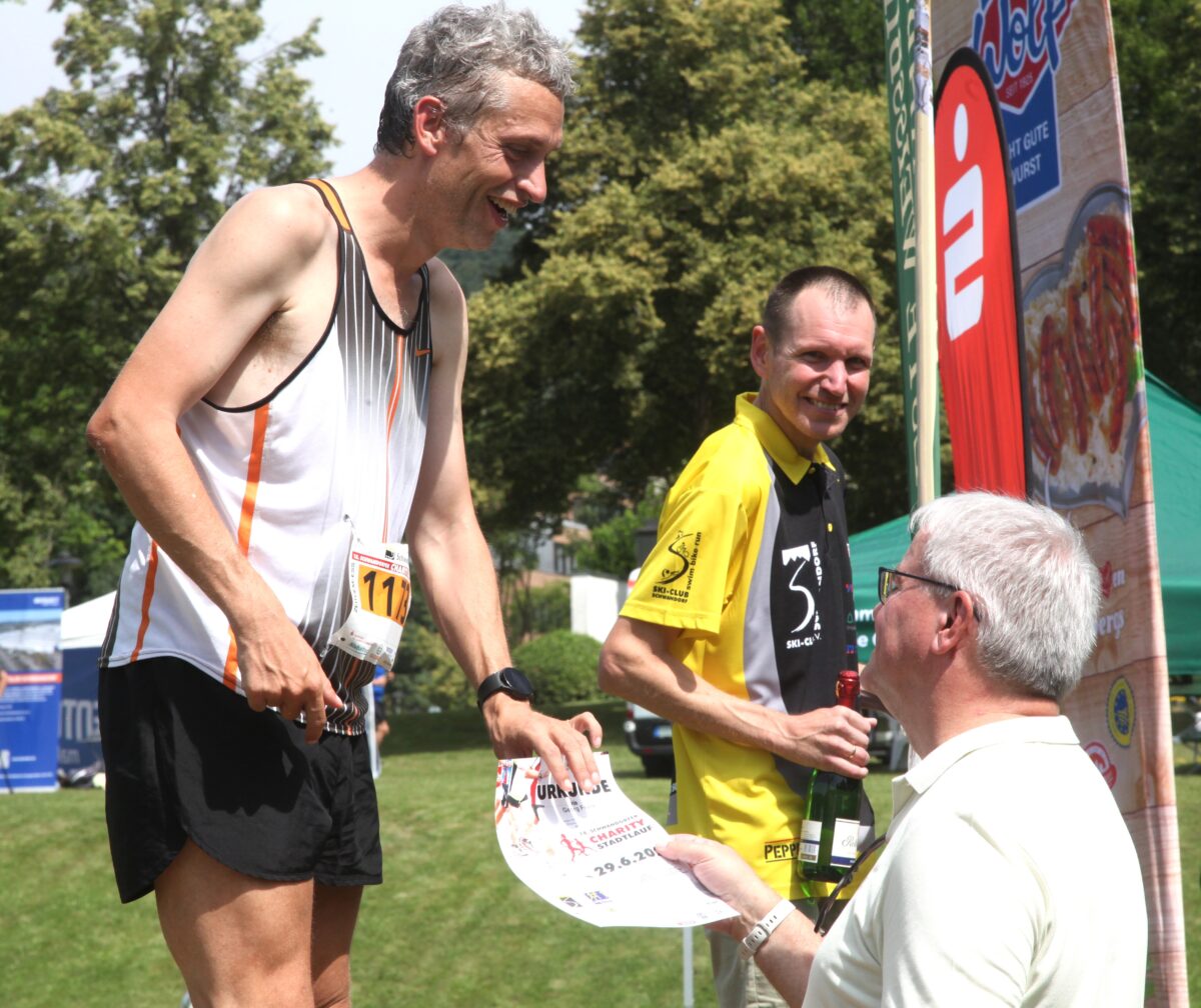 Hut ab auch vor der Leistung von Georg Fink (46) aus Burgweinting, der den Hauptlauf über 5000 Meter in 18:13 Minuten vor Jonas Kellner (24) aus Teublitz (18:23) und dem Lokalmatador Markus Müller (45) vom Ski-Club Schwandorf (18:41) gewann.