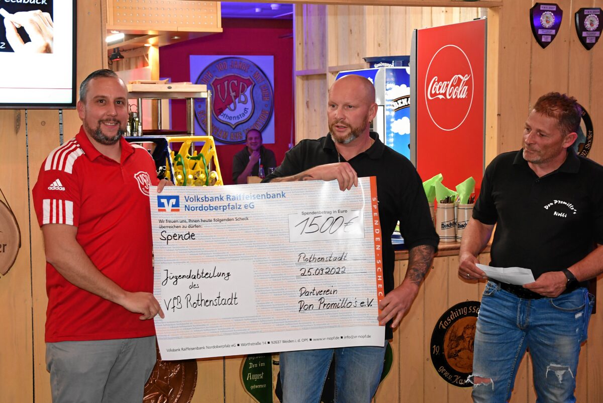 Nachwahlen für ausgeschiedene Vorstandsmitglieder und notwendige Satzungsänderung wurde allesamt einstimmig entschieden. Es folgten die Grußworte der Ehrengäste. Für die Stadt Weiden sprach Karl Bärnklau (Bündnis 90 / Die Grünen) in Vertretung des Oberbürgermeisters. Für den Bayerischen Landes-Sportverband sprach Herr Ernst Werner. Für den Stadtverband für Leibesübungen Weiden sprach Herr Reinhard Meier. Den Abschluss der Veranstaltung machte eine Spendenübergabe des befreundeten Dartclubs „Don Promillos“. Diese hatten bei der Feier zum 100- jährigen Bestehen des VfB Rothenstadt mehrere Turniere ausgerichtet. Erster Vorstand Michael Weiß und Kassierer Norbert Herman, übergaben einen Scheck über 1.500 Euro für die Jugendarbeit beim VfB Rothenstadt an Vorstand Daniel Troidl.