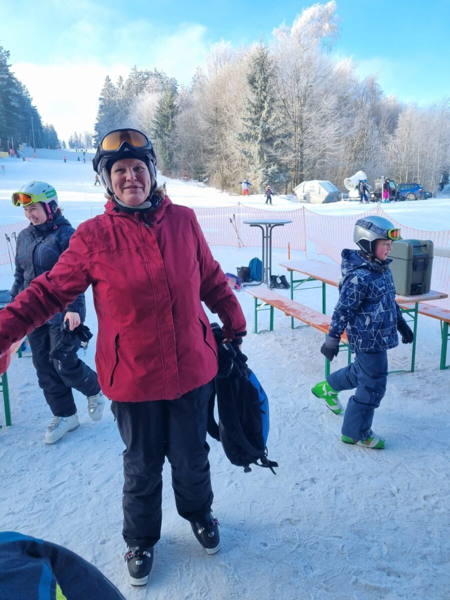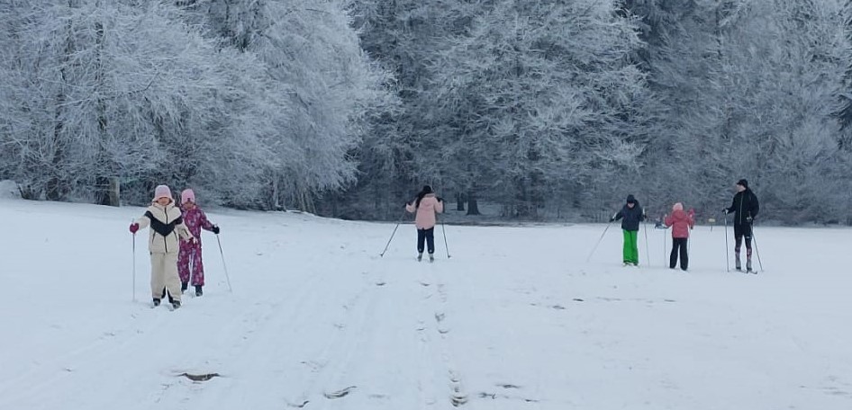 Parallel dazu wurde Ski-Langlauf angeboten. Dank ausreichender Schneelage konnte die Wiese an der Waldthurner OWV-Skihütte an der Neuenhammerstraße gespurt werden, sodass der Langlaufkurs erstmals seit Jahren wieder direkt vor Ort stattfand. Helmut Glaser vom OWV überprüfte den Zustand der Loipe und zog ergänzend frische Spuren. Die Langlaufausrüstung konnte kostenfrei vom Waldthurner OWV-Skiclub ausgeliehen werden. Unter professioneller Anleitung von OWV-Trainerin Johanna Grünauer sowie Schulpraktikant Lukas Grünauer sammelten 13 Kinder erste Erfahrungen auf den schmalen Skiern oder vertieften bereits vorhandene Kenntnisse. Lukas Grünauer baute zwischendurch spielerische Übungen wie Fangspiele mit nur einem Ski oder Slalomläufe durch Hindernisse ein, die den Spaßfaktor nochmals erhöhten und für zusätzliche Abwechslung und Motivation sorgten. Bei eisigen Temperaturen bot die beheizte OWV-Skihütte mit Kachelofen willkommene Aufwärmmöglichkeiten.