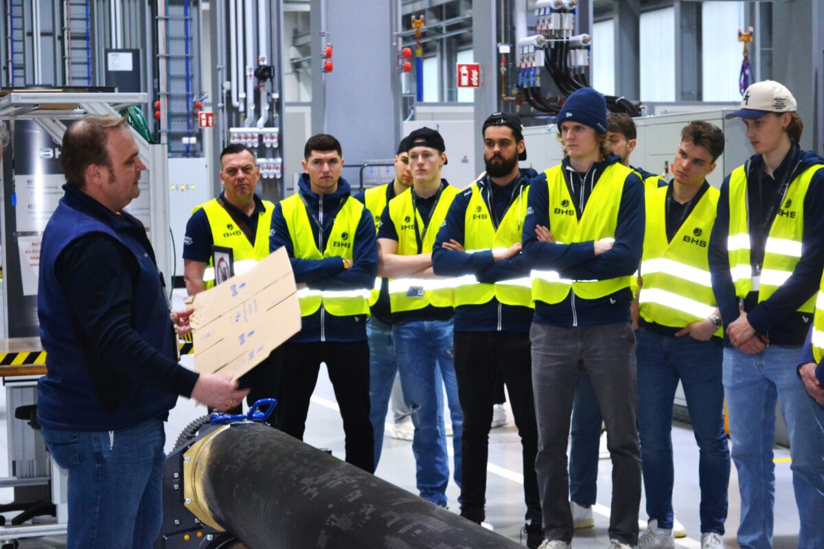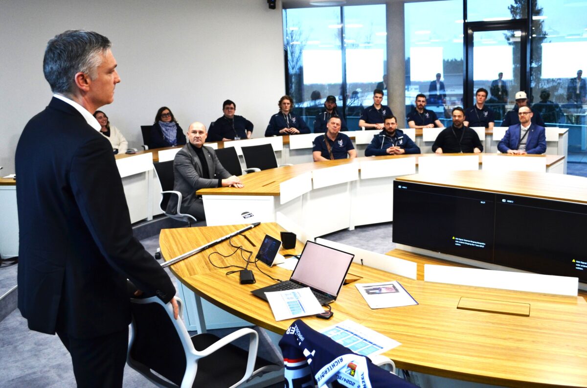 Die Eishockey-Delegation mit Sportlichem Leiter Jürgen Rumrich und Trainer Sebastian Buchwieser an der Spitze sowie fast allen einsatzfähigen Spielern war sichtlich beeindruckt von den Erläuterungen der BHS-Akteure. Markus Winkler, Head of Business Unit Lifecycle & CEO EUMEA, gab sich bei der Begrüßung als “begeisterter Fan” der Blue Devils zu erkennen. Er zollte ihnen ein dickes Lob für die tollen Leistungen der vergangenen Wochen und Monate in einer für Verein und Spieler “höchst anspruchsvollen Situation”. Danach schilderte Winkler die Entstehungsgeschichte des Unternehmens. Die Firma wurde ursprünglich vor über 300 Jahren als kleines Hammerwerk gegründet und hat sich heute als BHS Corrugated zum globalen Anbieter von Maschinen- und Anlagenbau, Lifecycle-Service und digitalen Lösungen für alle komplexen Anforderungen der Wellpappenindustrie entwickelt.
