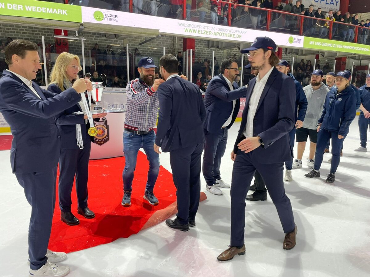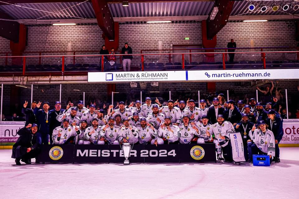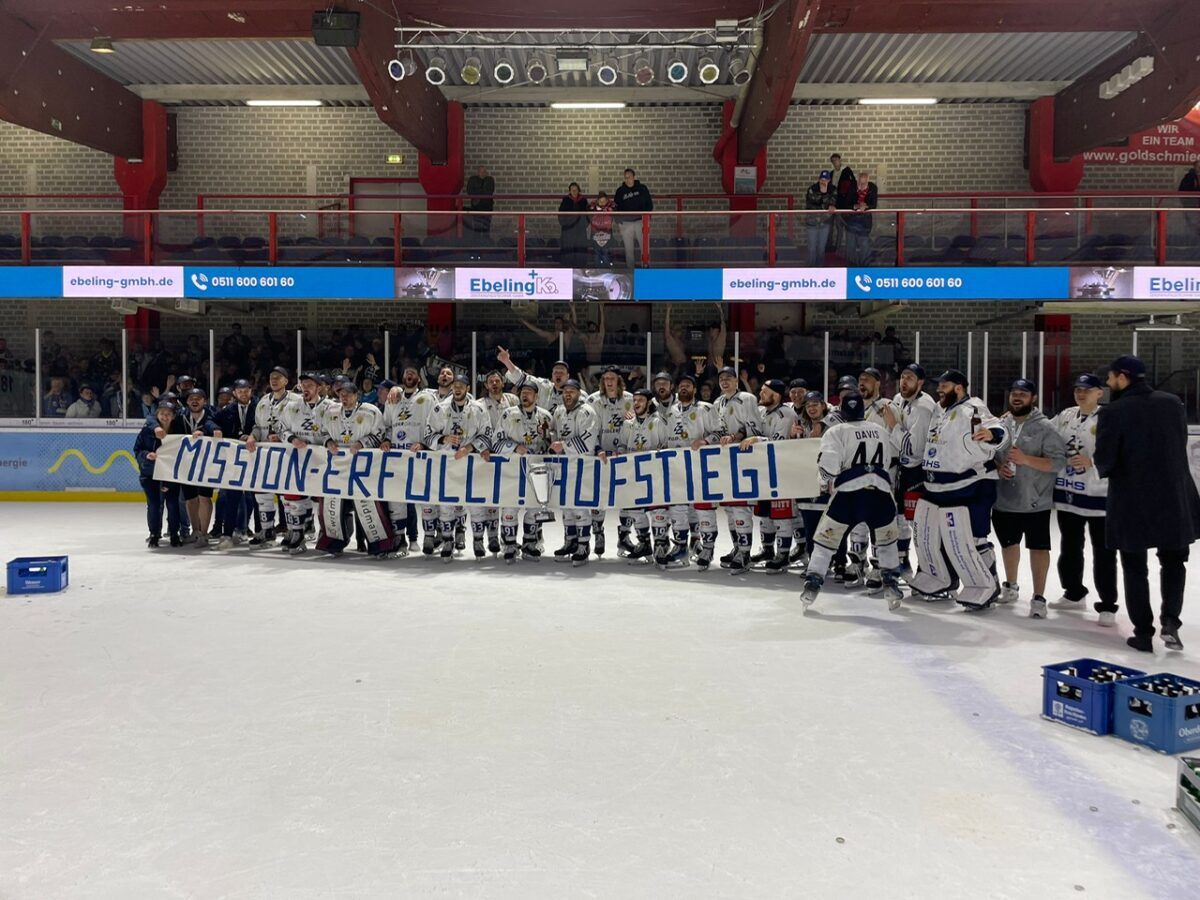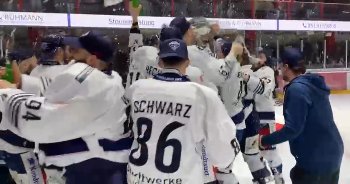 Schon zwei Sekunden vor der Schlusssirene gibt es kein Halten mehr: Ausgelassen stürmt die komplette Bank der Blue Devils aufs Eis in Mellendorf. Helme, Schläger und Ausrüstungsgegenstände fliegen aufs Eis. Es ist geschafft: Durch den souveränen 5:1-Triumph gegen die Hannover Scorpions im sechsten Finalspiel sichern sich die Weidener die Oberliga-Meisterschaft und den Aufstieg in die DEL 2.