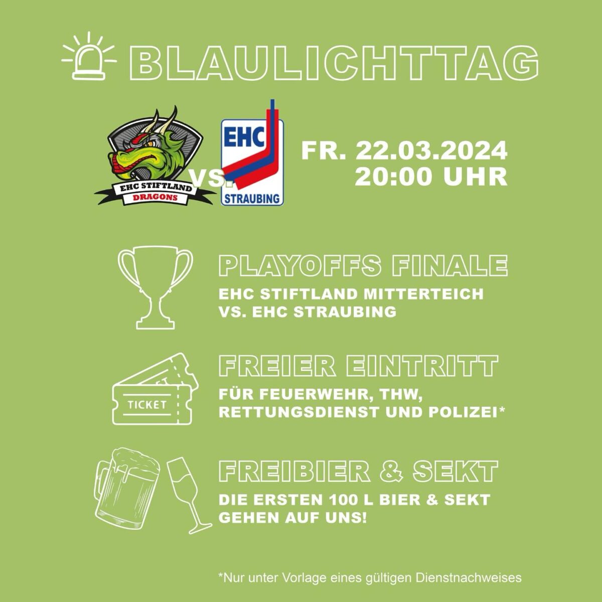 Am Freitag (Erstes Bully um 20 Uhr) brennen die Cracks des EHC Stiftland-Mitterteich im zweiten Finale um Meisterschaft und Landesligaaufstieg auf Revanche. Zumal man dann wieder auf seinen tschechischen Torjäger Harkabus zurückgreifen kann. Als Dank für alle Ehrenamtler lädt der Verein zu einem „Blaulichttag“ ein. Unter dem Motto „Eiszeit für Lebensretter“ haben die „Helden des Alltags“ von Feuerwehr, Rettungsdienst, Polizei, Technischem Hilfswerk (THW) oder Bundeswehr gegen Vorlage des Dienstausweises freien Eintritt zum absoluten Saisonhöhepunkt.