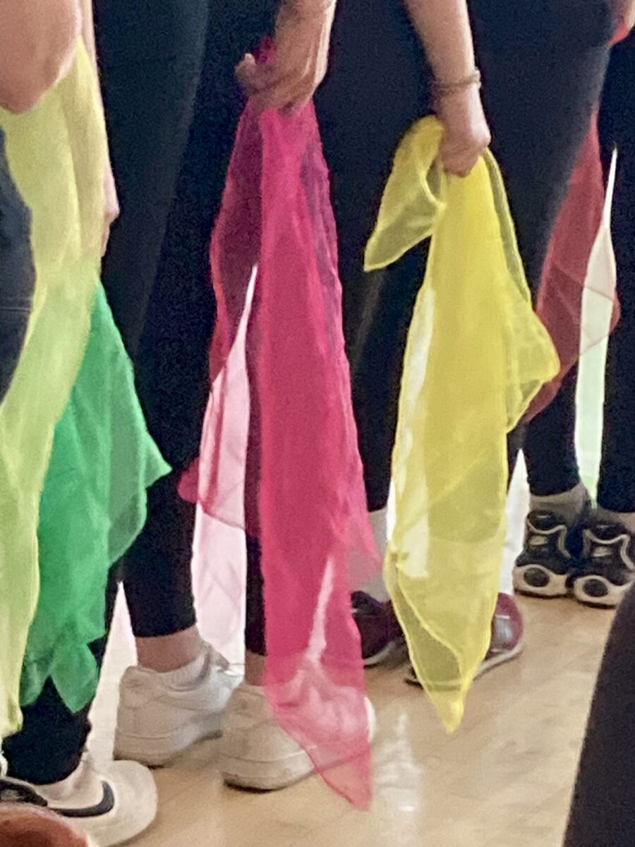 - bunte, durchsichtige Tücher schwenkend, die man auch trefflich übers Gesicht legen kann – man muss dann nur unglaublich schnell laufen, damit sie nicht herunterfallen. Logisch!