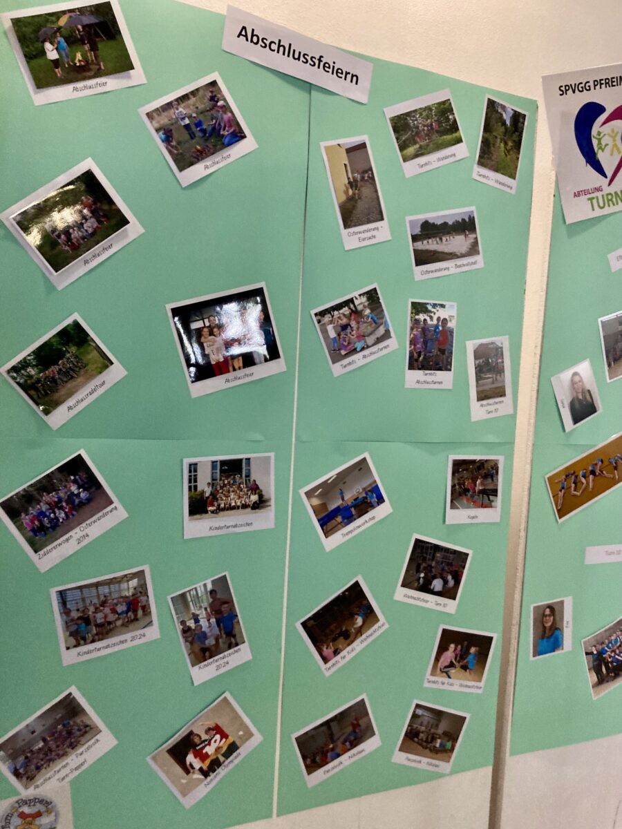 Im Vorraum der Turnhalle wurden nicht nur Brotkuchen und Brezen verspeist und die Spendenbox gefüllt, sondern auch erinnert in Form von Fotocollagen an Faschingsfeiern und Ferienprogramme, Wettkämpfe und Abschlussfeiern, Eltern-Kind-Turnen, Mutter-Kind-Turnen, Turnhits für Kids und das Purzelvolk.
