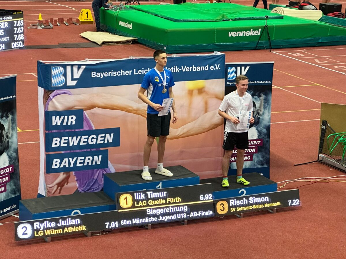 Simon Risch setzte am ersten Tag ein deutliches Ausrufezeichen. Über 60 Meter sprintete er mit neuer persönlicher Bestzeit von 7,22 Sekunden auf einen hervorragenden dritten Platz und wurde damit Dritter bei der Bayerischen Meisterschaft. In einem hochklassig besetzten Feld bestätigte er eindrucksvoll seine Schnelligkeit und seine Stärke im Wettkampf.