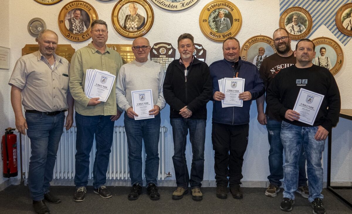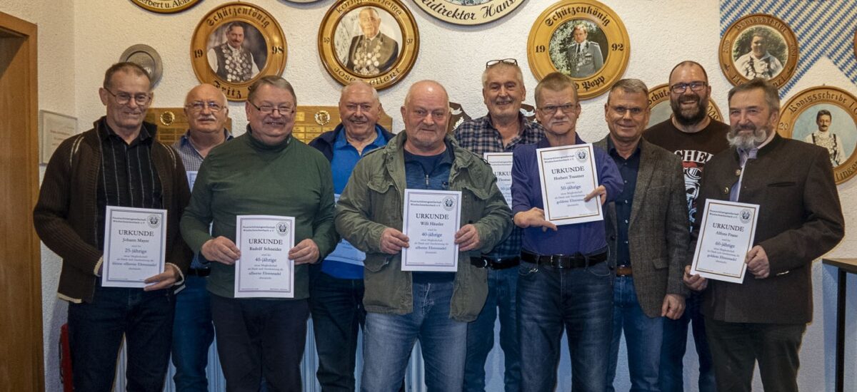 Urkunden für langjährige Mitgliedschaft erhielten für 60 Jahre Mitgliedschaft Werner Bauer, Peter Brünnig und Alfons Franz. 50 Jahre im Verein sind Thomas Stich und Herbert Trautner. Seit 40 Jahren Halten Werner Bärnklau, Karlheinz Englert, Wolfgang Gröschl, Willi Häusler, Thomas Kahl, Thomas Köllner, Christian Kraus, Wolfgang Meisl, Fitz Ott und Rudolf Schneider die Treue. Für 25 Jahre zeichnete der Schützenmeister Stephan Härtl, Johann Mayer, Reinhold Schröml, Rainer Spachtholz und Stephanie Zergiebel aus.