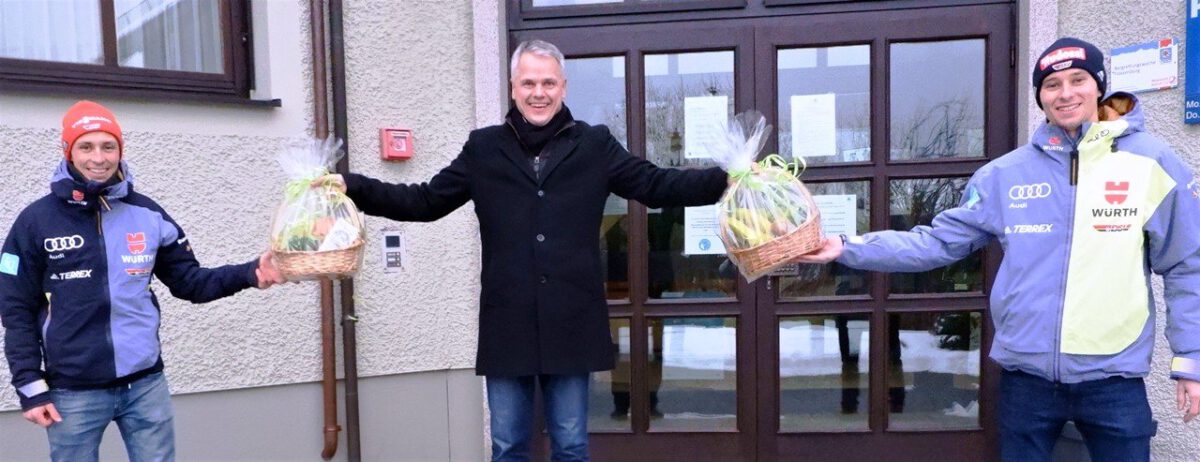 Mit einem Korb voll guter Wünsche, Obst und Glücksschokolade hat Bürgermeister Thomas Meiler die Flossenbürger Kombinierer Eric Frenzel und Terence Weber zu den olympischen Winterspielen verabschiedet.