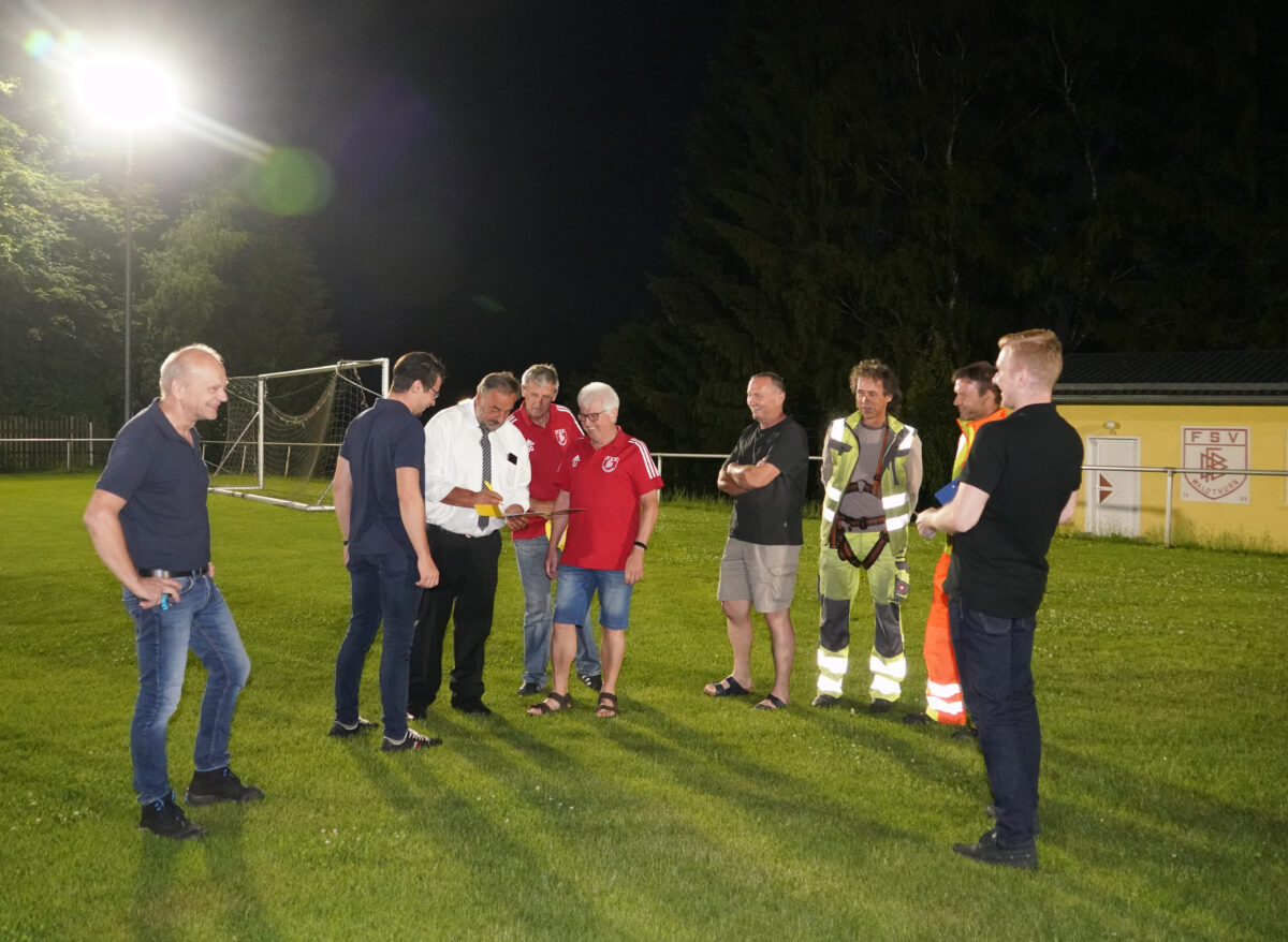 Nachdem die Installation abgeschlossen war, waren Fabian Eisenrieth, Matthias Jackl und Gerhard Schmerber vom Bayernwerk-Betriebsmanagement am späten Abend nach Einbruch der Dunkelheit gegen 22 Uhr zum FSV-Sportgelände gekommen, um die Anlage abschließend zu überprüfen und zu endjustieren.